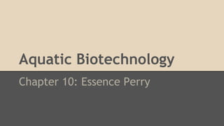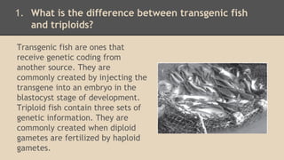 Transgenic fish contain genetic material from another organism that has been injected into their embryos, while triploid fish naturally contain three sets of genetic material. To assess the risk of genetically engineered marine species, similar living conditions should be recreated and the engineered species observed to see how they interact. Aquaculture provides food and economic benefits but also poses environmental risks if fish escape or their waste pollutes the environment. Genetic manipulation of fish is an interesting aspect of aquatic biotechnology because it allows fish to thrive in different environments by changing traits like temperature tolerance and muscle mass. Important aquaculture species include salmon, trout, tilapia, oysters and mussels. Biotechnology may help restore fish stocks through methods like biore