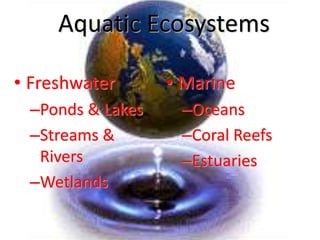 The document discusses various types of aquatic ecosystems including freshwater ecosystems like ponds, lakes, streams, rivers, and wetlands as well as marine ecosystems like oceans, coral reefs, and estuaries. It provides details on the characteristics of each ecosystem, describing factors like temperature, salinity, species diversity, food webs, and zones. It also discusses threats to these ecosystems from human activities like pollution, development, fishing, and climate change.