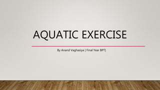 Aquatic exercise utilizes water to facilitate various therapeutic interventions, such as stretching and resistance training, with the unique properties of water allowing for diverse treatment approaches. The goals include enhancing range of motion, cardiovascular exercise, and minimizing injury risk, while precautions must be taken for specific health conditions. Regular maintenance of aquatic exercise facilities is crucial to prevent infections and ensure safety.