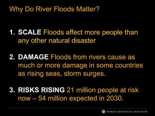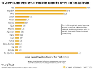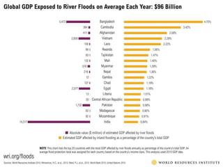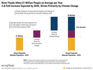 River floods pose significant risks, affecting over 21 million people globally, with projections estimating 54 million at risk by 2030. The economic impact is substantial, with current risks amounting to $96 billion, rising to $521 billion by 2030, particularly in countries like India, Bangladesh, and China. The document highlights the importance of global flood risk assessment and future projections to inform protective measures.