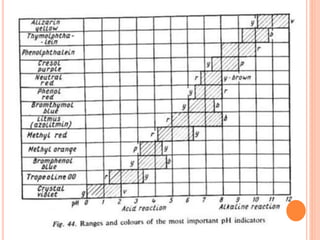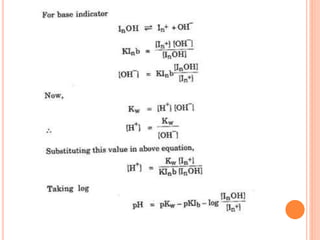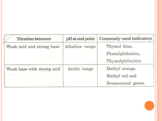 The document discusses acid-base titrations and concepts. It describes primary and secondary standard substances used for titrations. The key theories covered include Arrhenius, Bronsted-Lowry, and the law of mass action. It also discusses strong vs weak electrolytes, acid and base strength definitions, hydrolysis of salts, end point detection using indicators, and different types of neutralization curves between strong acids/bases and weak acids/bases. Neutralization indicators and their properties are explained in detail through Ostwald and resonance theories.