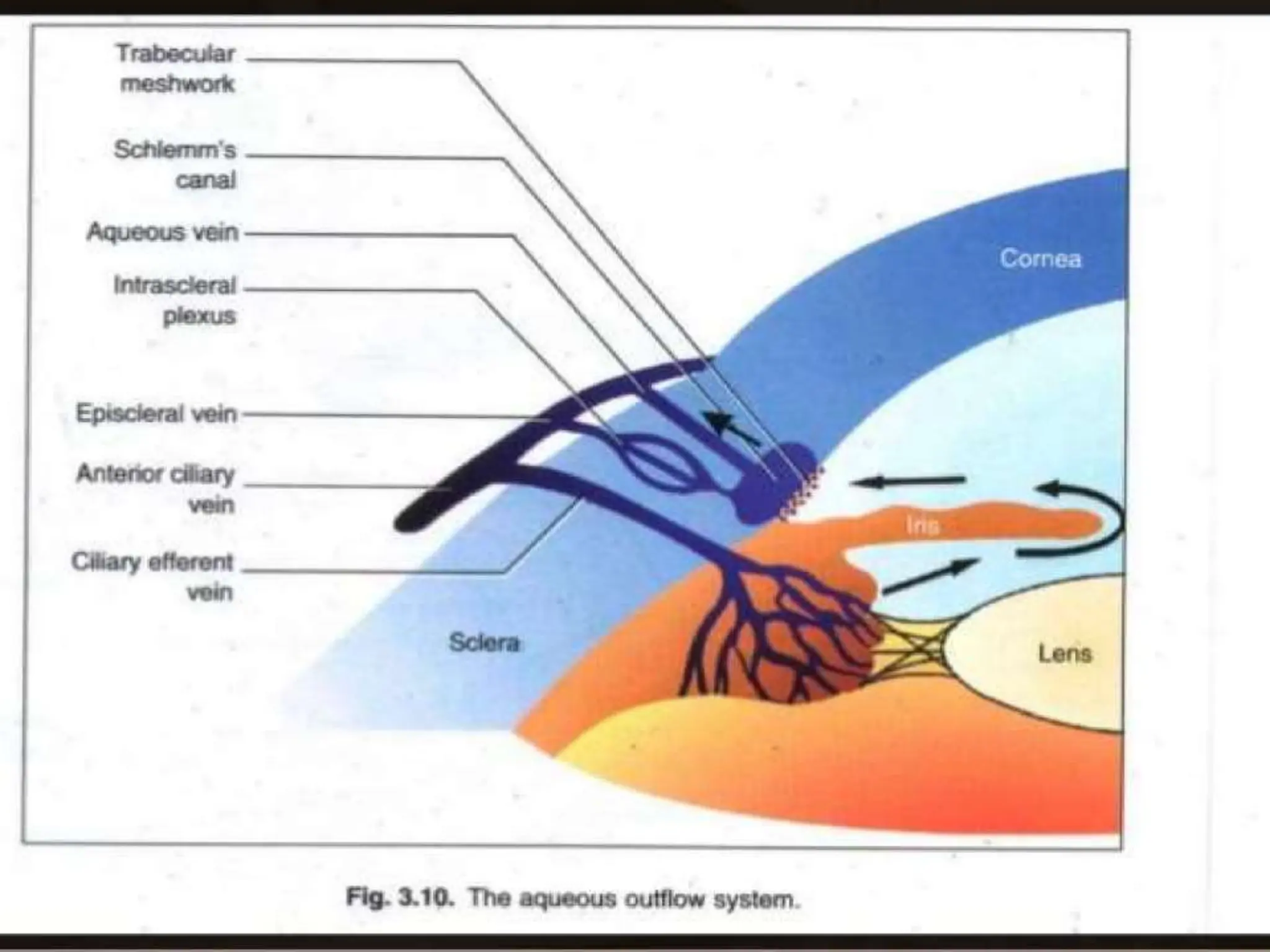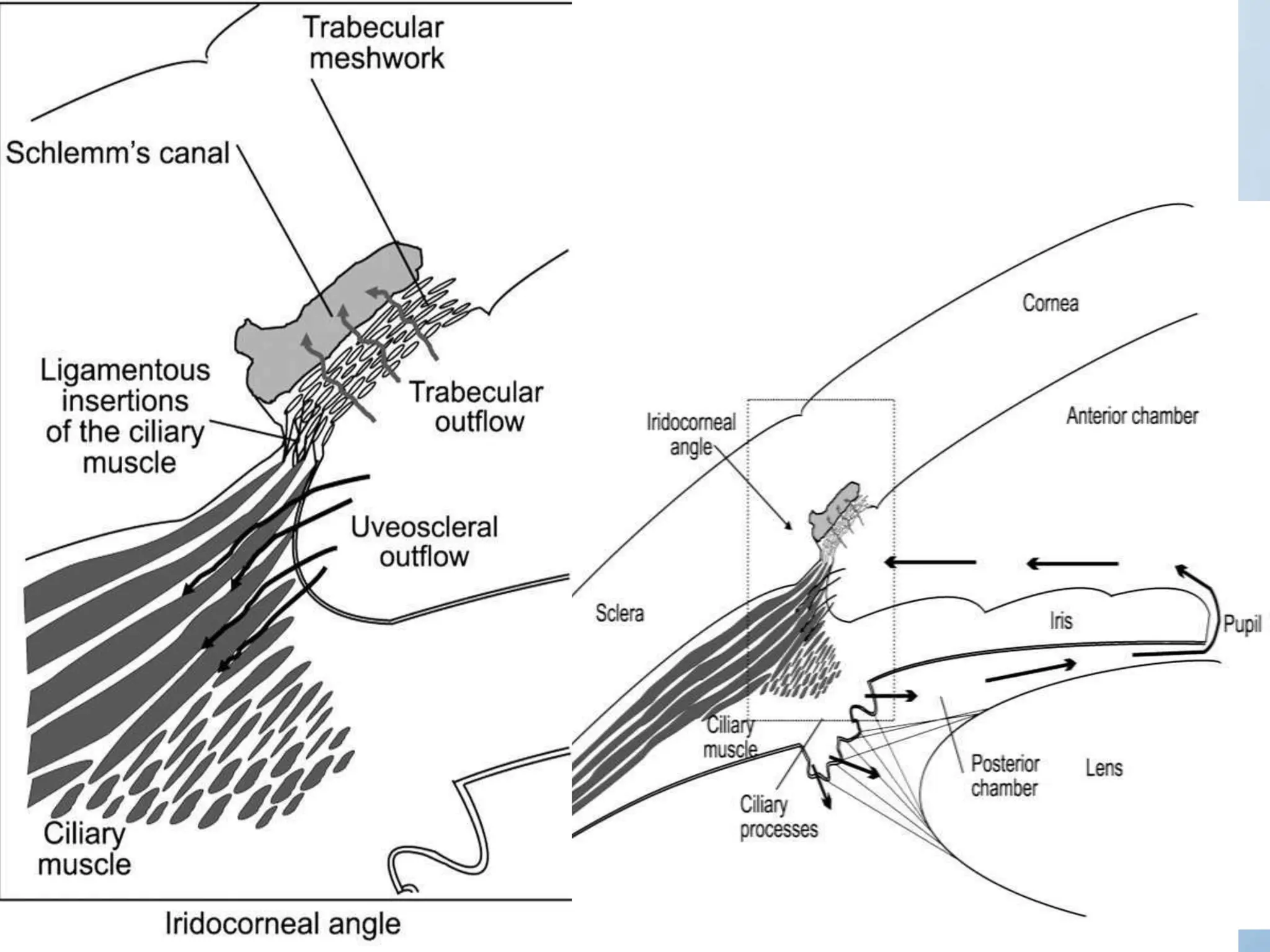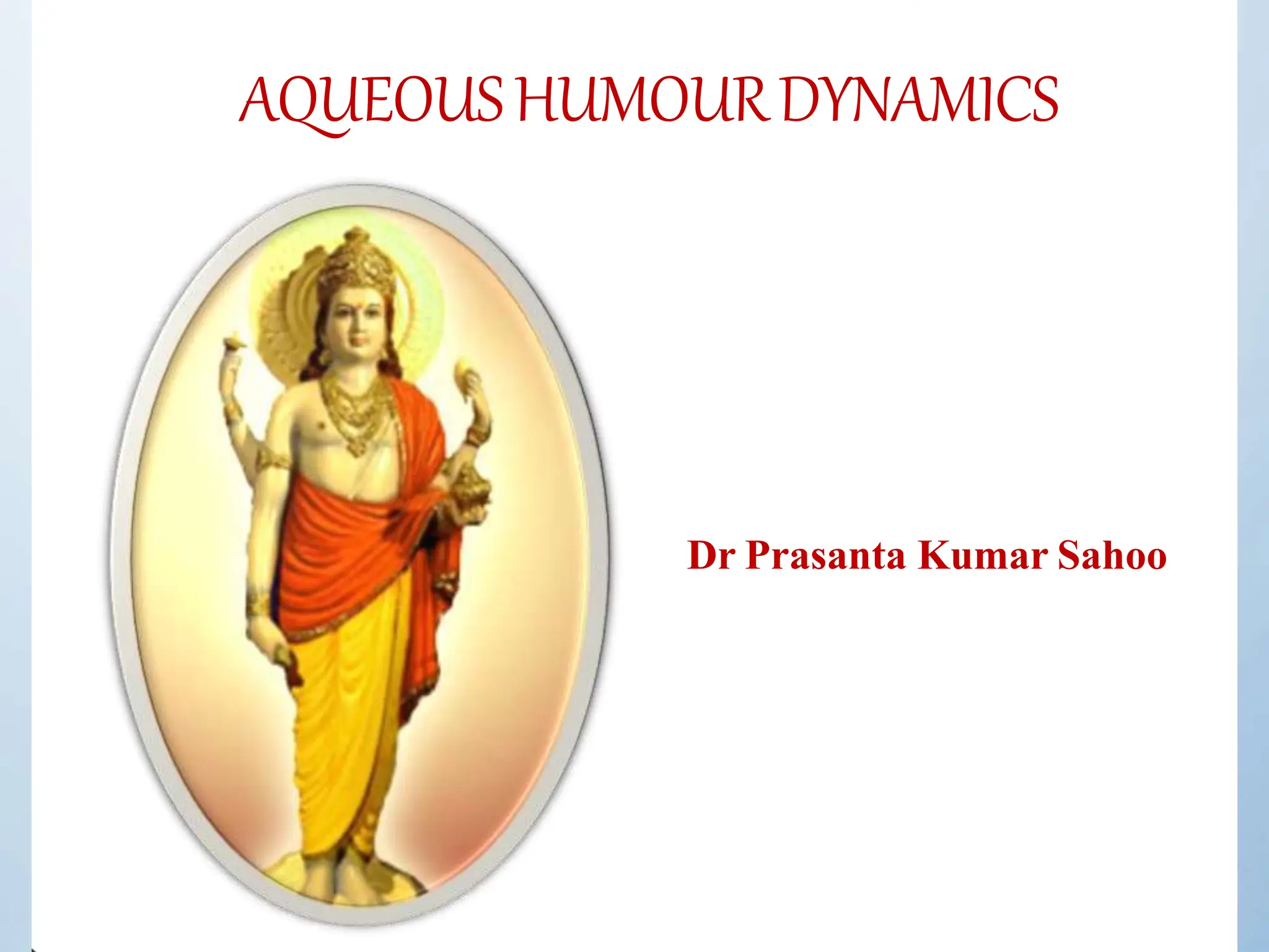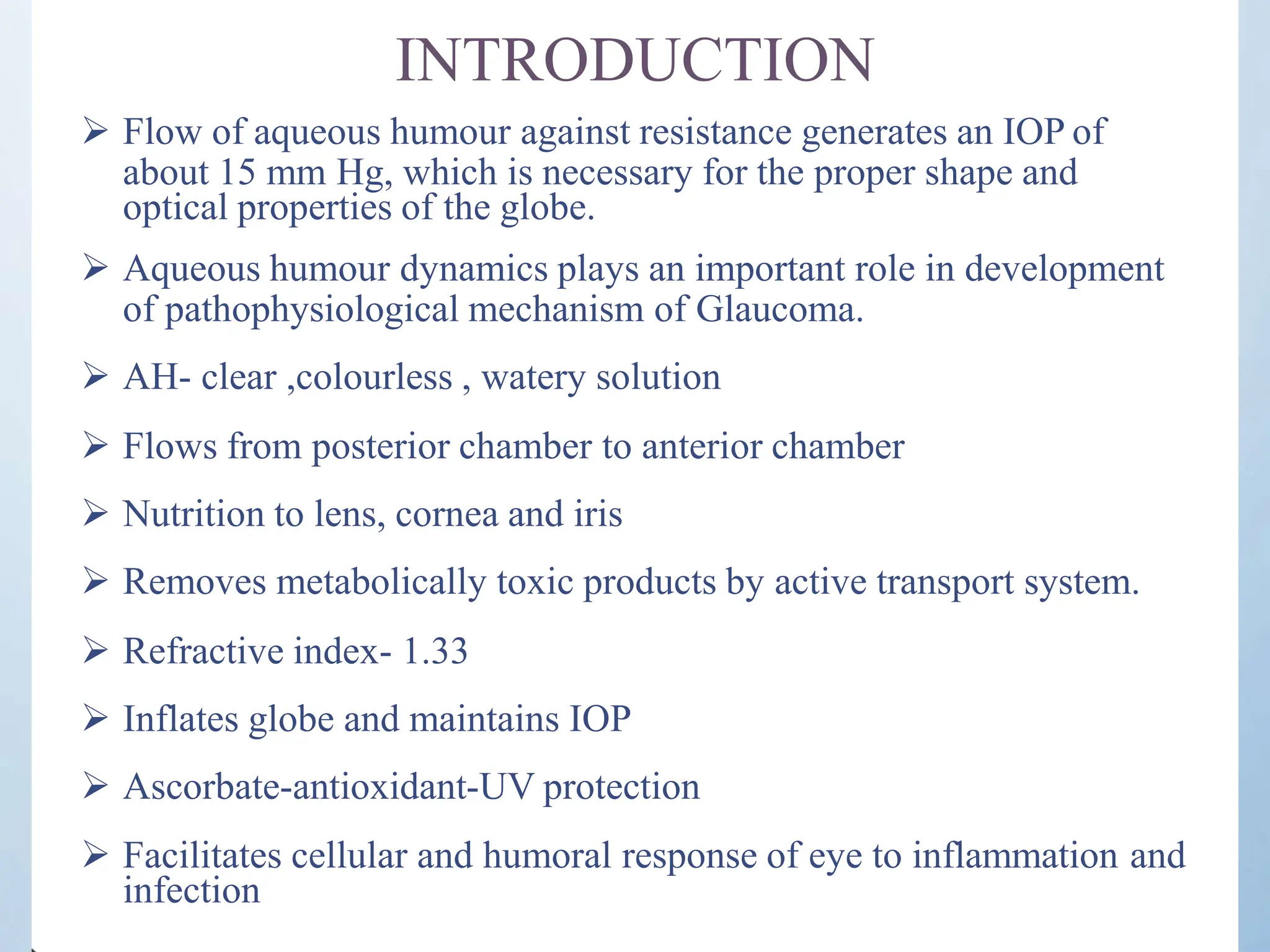 The document discusses aqueous humour dynamics, which play an important role in glaucoma pathogenesis. Aqueous humour is produced by the ciliary processes at a rate of 2.0-2.5 μl/min through ultrafiltration, active secretion, and diffusion. It flows from the posterior chamber to the anterior chamber, providing nutrients and removing waste. Aqueous humour exits through the trabecular meshwork and Schlemm's canal via conventional outflow or through the iris and ciliary muscle via unconventional outflow. The balance of aqueous humour inflow and outflow regulates intraocular pressure.