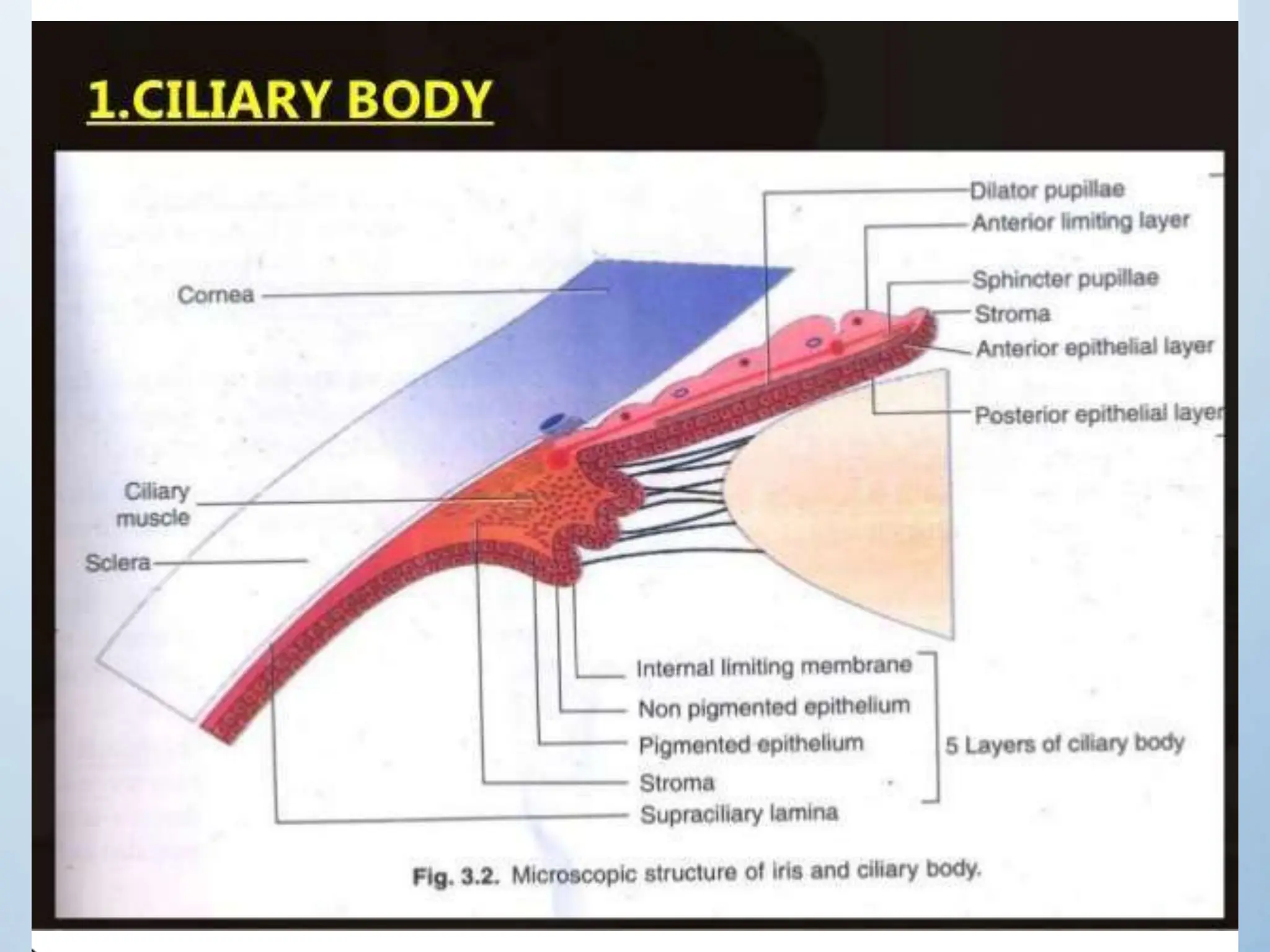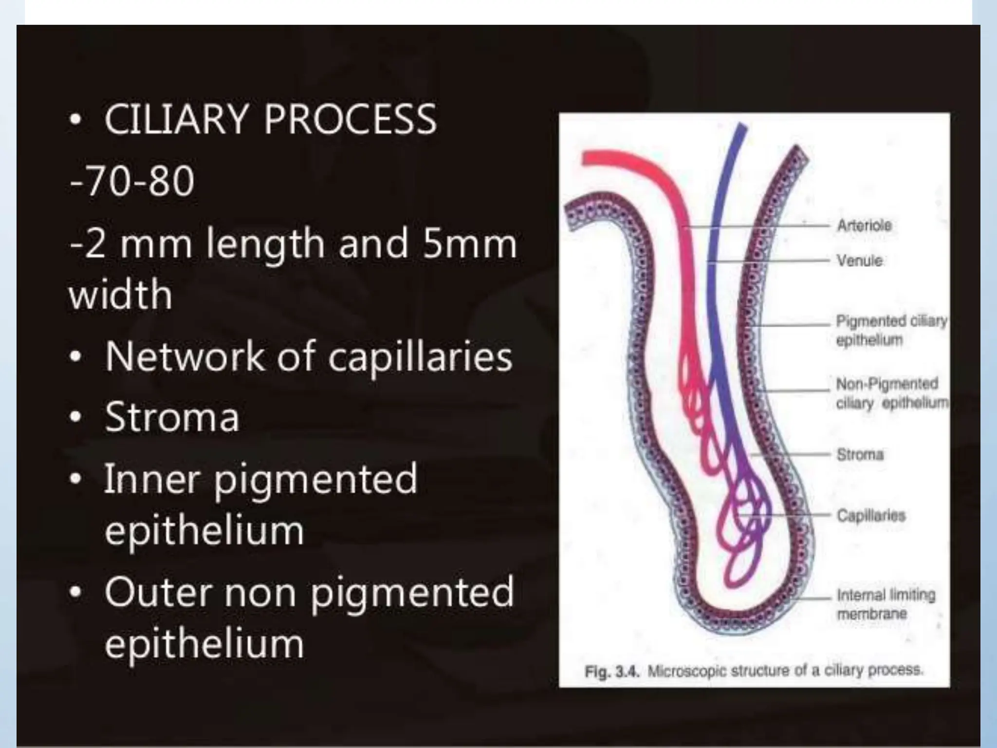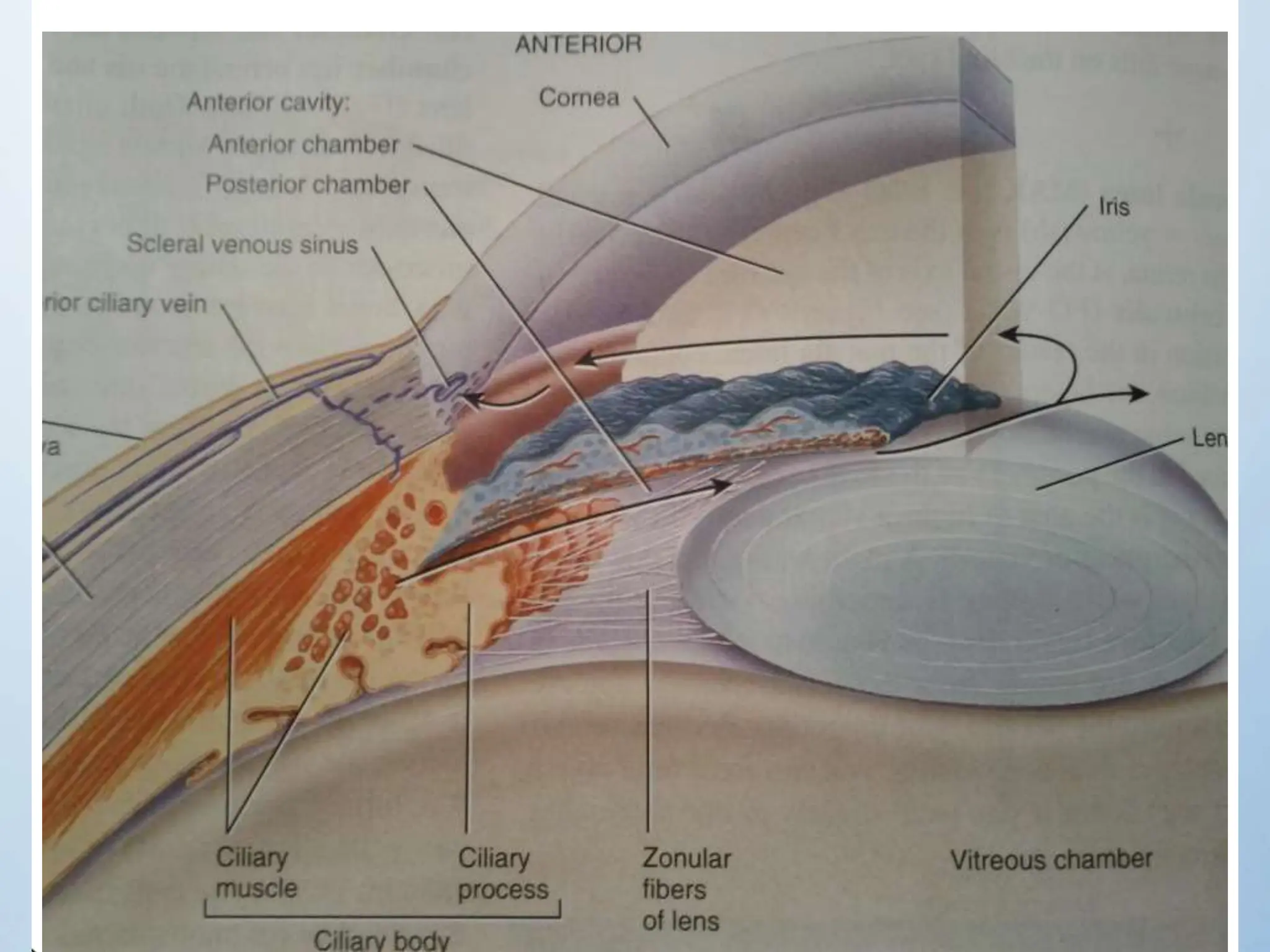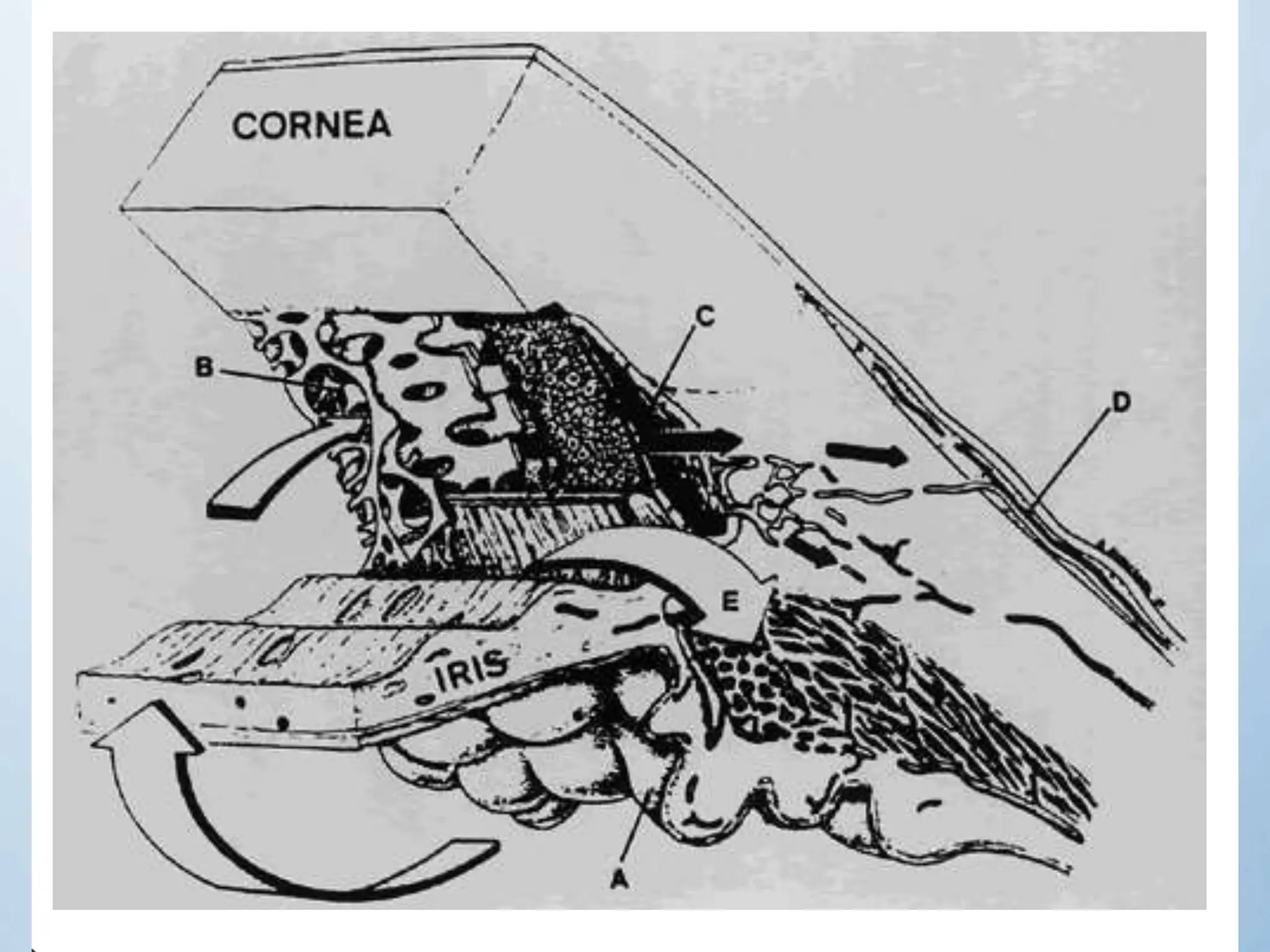 The document discusses aqueous humour dynamics, which play an important role in glaucoma pathogenesis. Aqueous humour is produced by the ciliary processes at a rate of 2.0-2.5 μl/min through ultrafiltration, active secretion, and diffusion. It flows from the posterior chamber to the anterior chamber, providing nutrients and removing waste. Aqueous humour exits through the trabecular meshwork and Schlemm's canal via conventional outflow or through the iris and ciliary muscle via unconventional outflow. The balance of aqueous humour inflow and outflow regulates intraocular pressure.