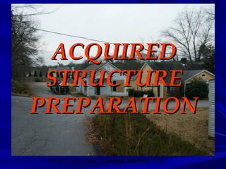 This document provides instruction on preparing an acquired structure for live fire training exercises. It outlines the necessary permits, notifications, planning, and safety procedures that must be completed before conducting burn evolutions. Key steps include obtaining owner documentation and burn permits, developing pre-burn plans, rendering the structure and site safe by addressing utilities, structural integrity hazards, and protecting exposures, and reviewing all permit and safety procedures have been addressed. The goal is to make the acquired structure safe for conducting live fire training simulations.