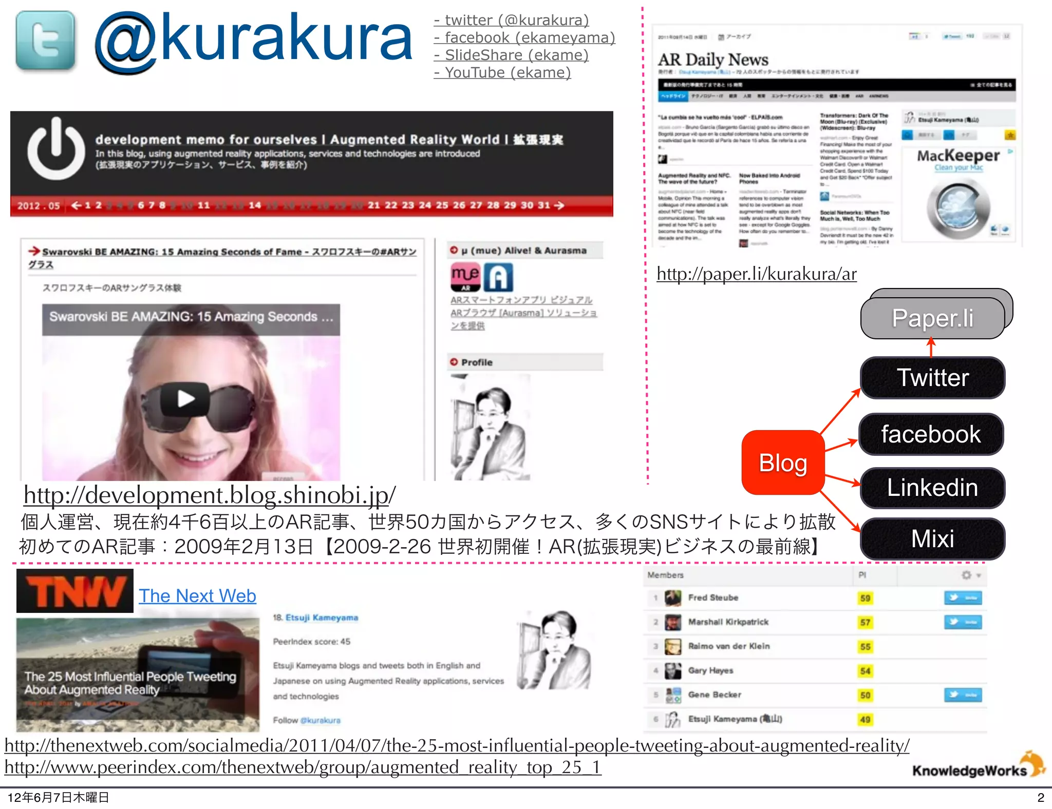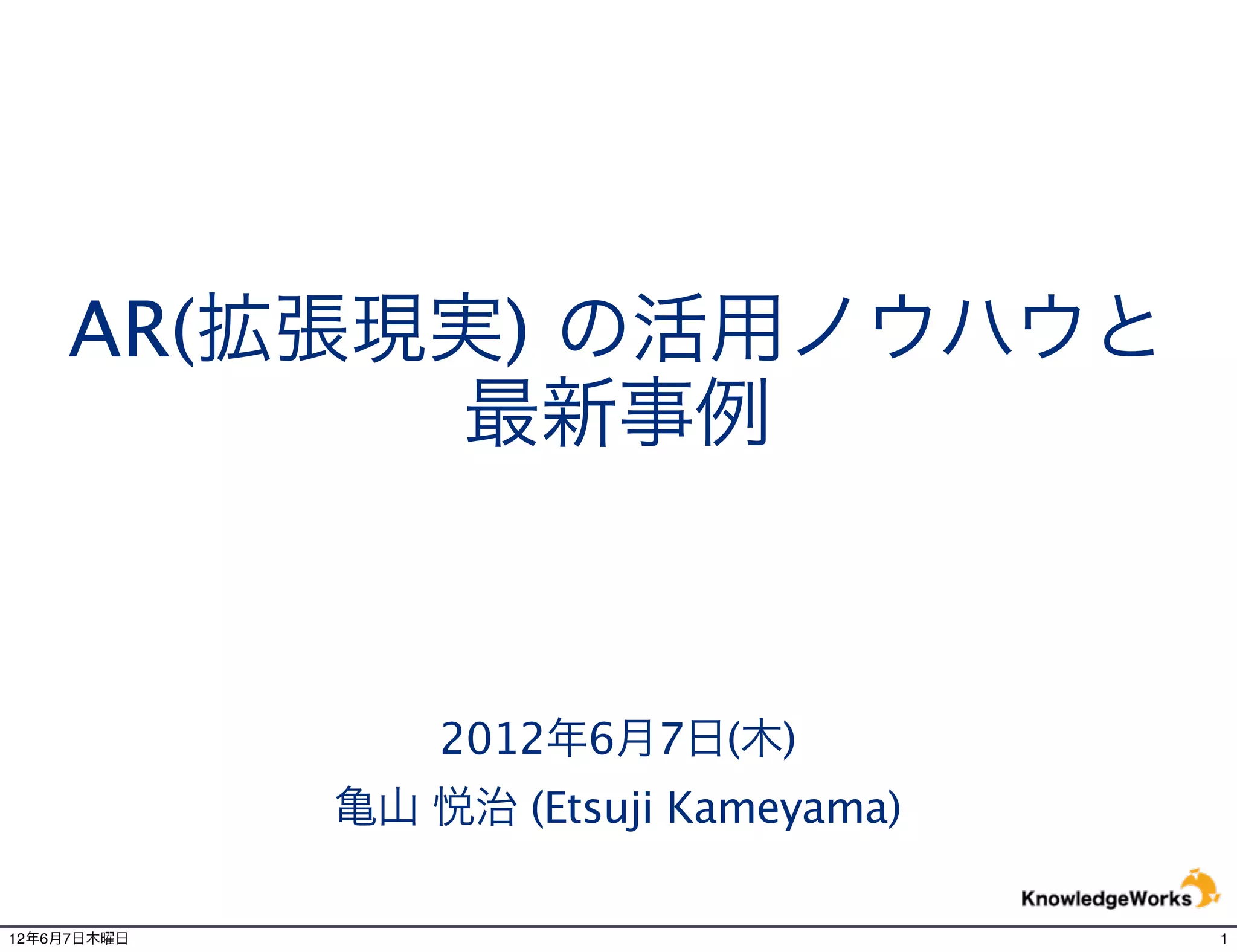 Trend and use case 20120607a with Ar (Augmented reality) -Ar(拡張現実) の動向と活用事例 1. 2. @kurakura