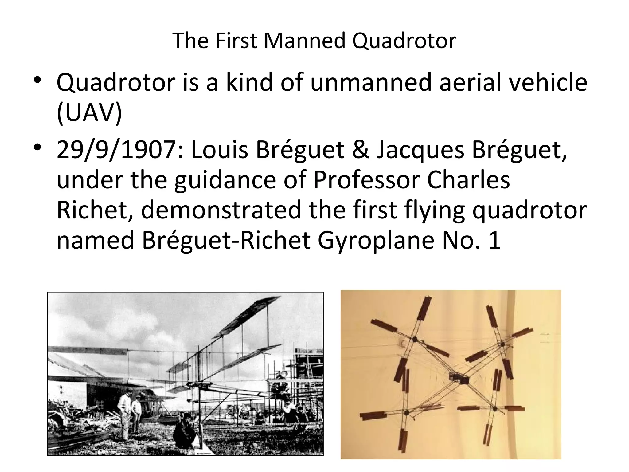The document describes the anatomy and dynamics of a quadrotor unmanned aerial vehicle (UAV). It discusses the first manned quadrotor flight in 1907 and advantages of quadrotors such as vertical take-off and landing. Key components of quadrotor structure and motion including motors, frames of reference, state variables, and kinematic and dynamic equations are presented. Thrust forces from each motor and gravity are expressed as components of the total force acting on the quadrotor.