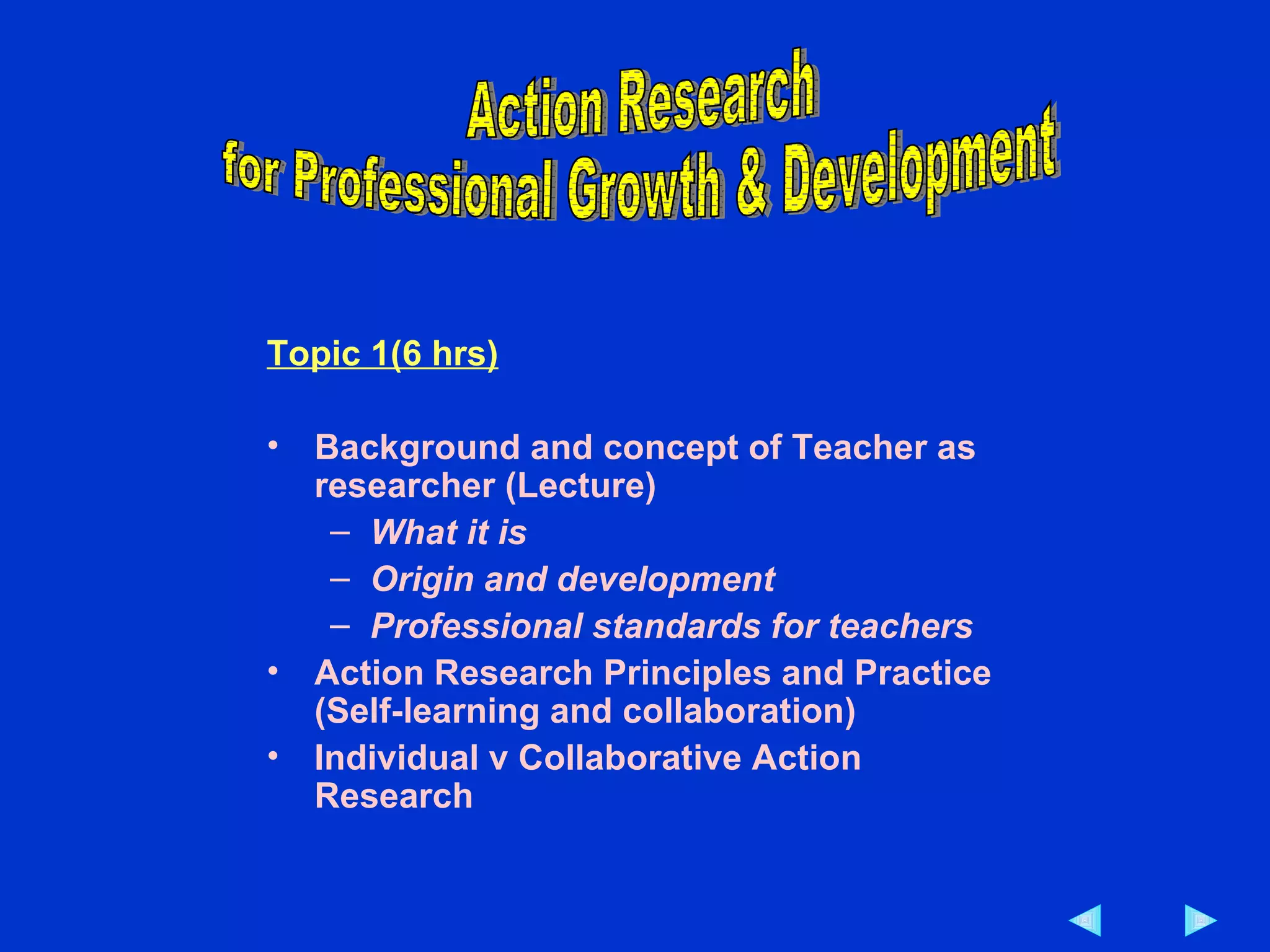 Action research refers to a methodological approach where teachers systematically examine their own educational practices and contexts to better understand them and be able to improve and refine their techniques. It originated in the 1940s and has been developed by various scholars over the decades as a means for teachers to study their own practices through a cycle of planning, acting, observing, and reflecting. This allows them to test new strategies and ideas in the classroom and gather evidence on their impact and effectiveness.