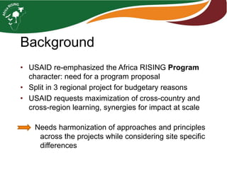 This document discusses approaches for the second phase of the Africa RISING program to maximize synergies and impact across projects. It outlines plans to establish common indicator frameworks, typologies for tailoring research, program-wide analyses, communities of practice for experts, coordinated capacity development strategies, and improved communication to enhance scaling and knowledge sharing. The goal is to better harmonize approaches while allowing for regional differences through increased collaboration.