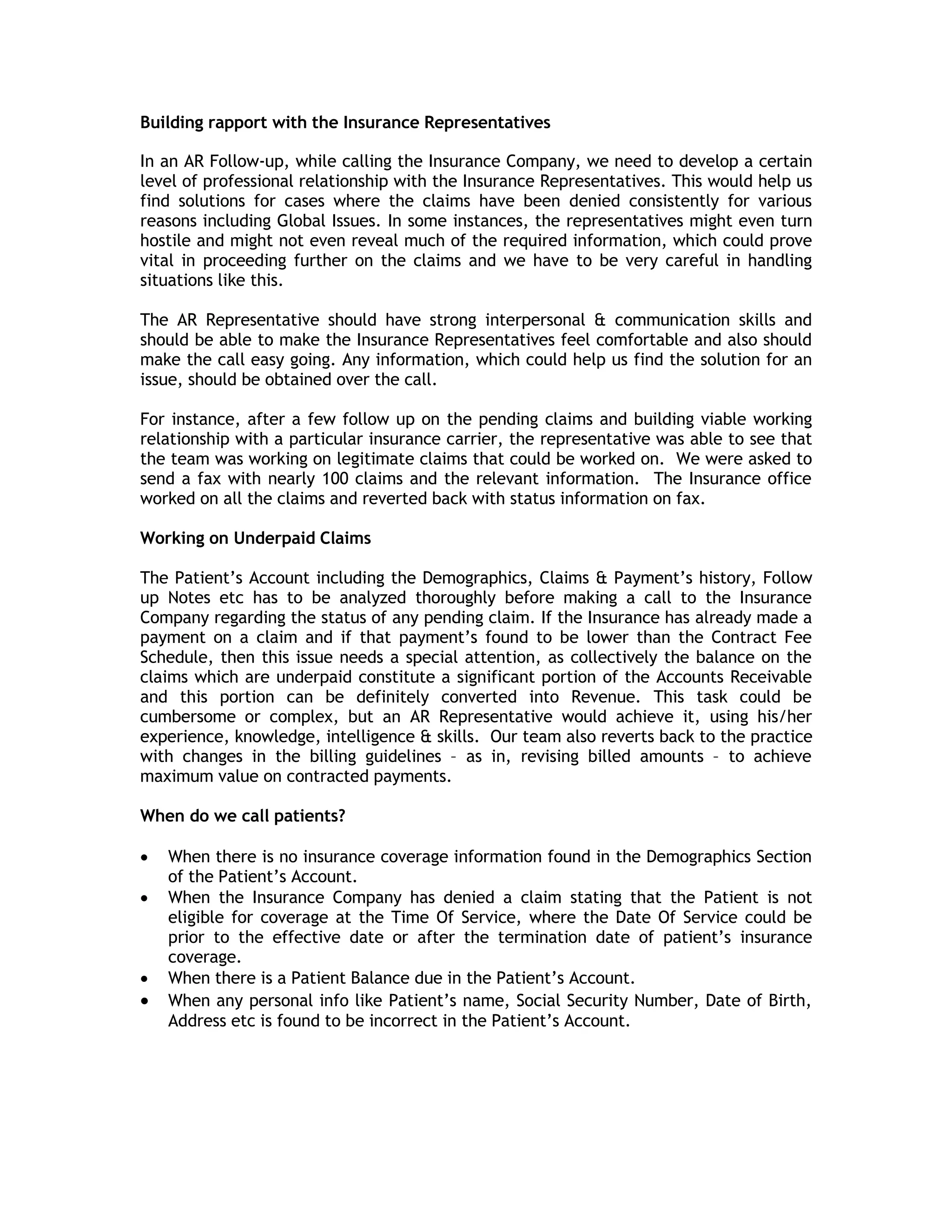 The document discusses building rapport with insurance representatives in order to obtain necessary claim information and resolve denied claims. It states that developing professional relationships and making representatives feel comfortable can help obtain solutions. For example, after building a relationship over several calls, one representative provided status on nearly 100 claims after being asked to review legitimate claims. The document also discusses analyzing patient accounts thoroughly before contacting insurers about underpaid claims, as collecting underpayments can generate significant revenue.