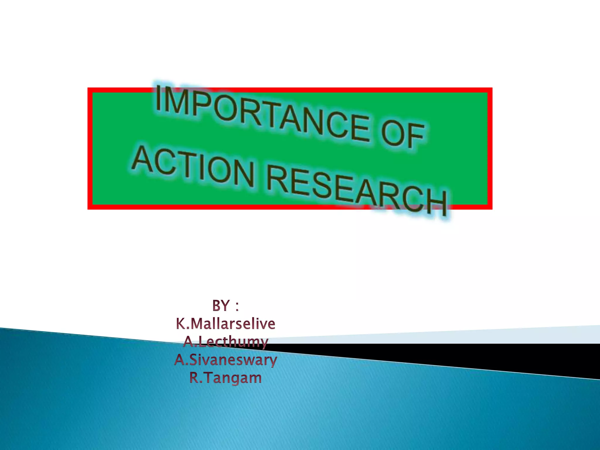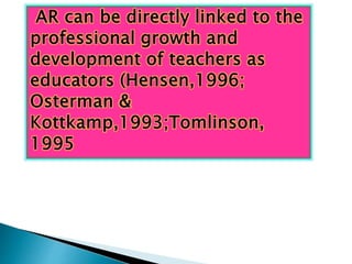 Teacher action research allows teachers to study their own classrooms to improve education quality and empower teachers. It helps teachers develop knowledge directly from their classroom experiences, promotes reflective teaching, and expands teaching methods. Teachers can then implement practices best suited to their students' needs based on the data collected. Overall, action research facilitates teacher empowerment to make informed decisions that can enhance student achievement and create more effective learning communities.