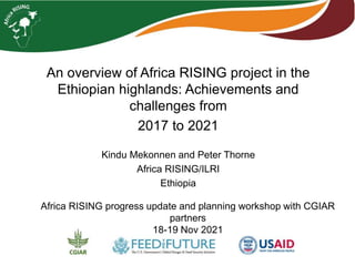 The document provides an overview of the Africa Rising project in the Ethiopian Highlands, detailing its research achievements, publications, and capacity development efforts from 2017 to 2021. It highlights the project’s outreach to over 360,000 households and the challenges faced, such as the COVID-19 pandemic and funding mismatches. Future steps include strengthening the evidence base for outcomes, producing legacy products, and designing exit strategies.