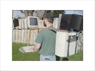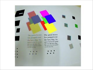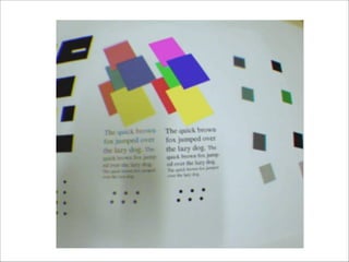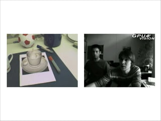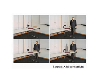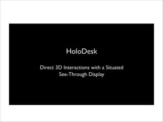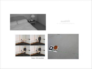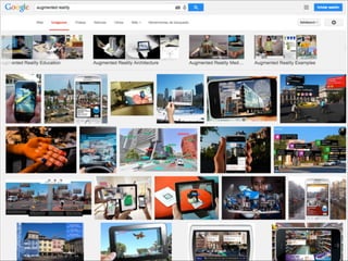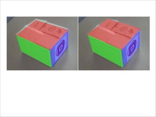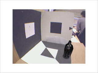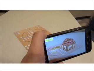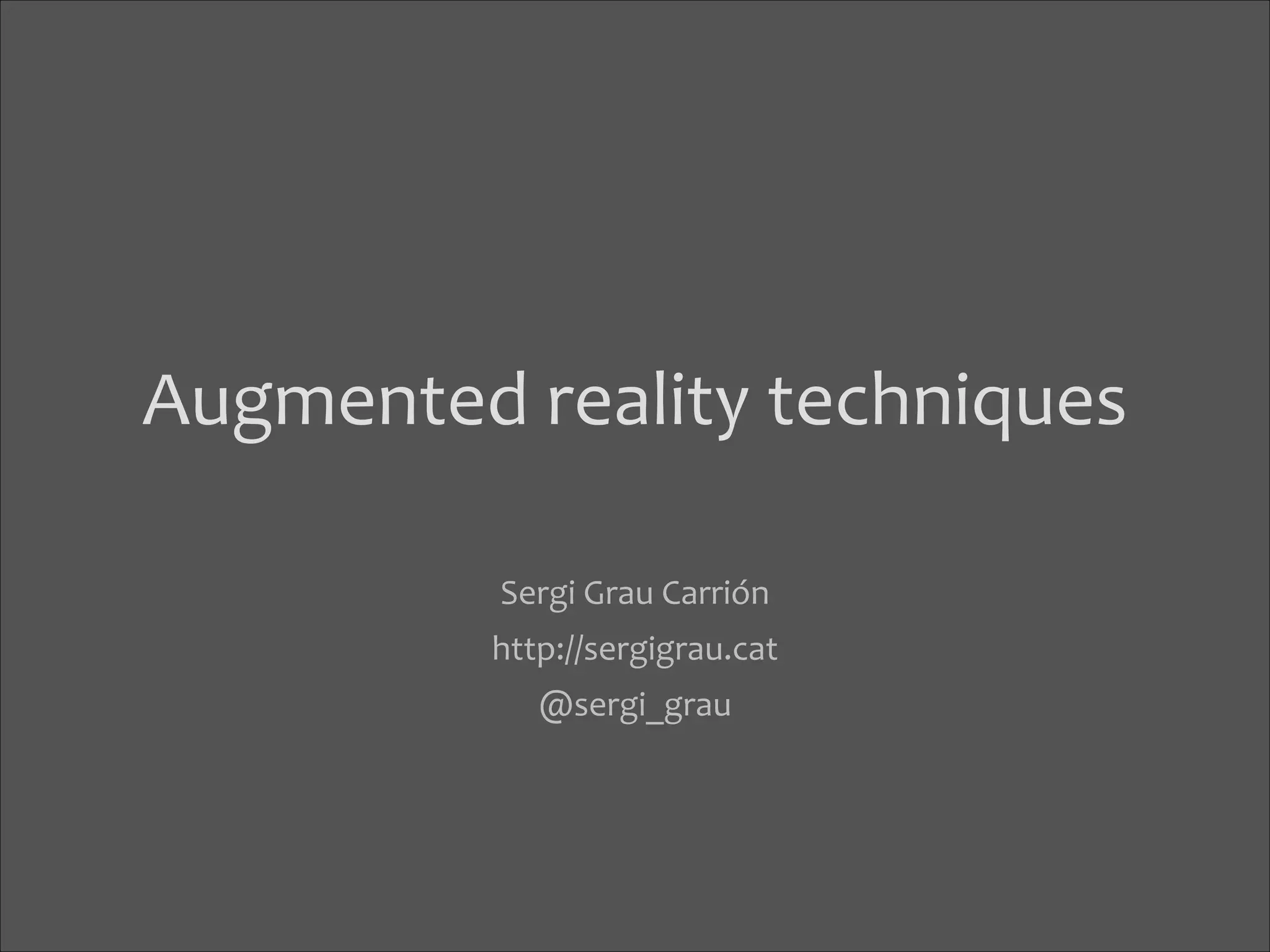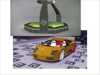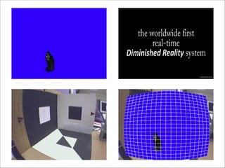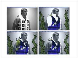 The document discusses augmented reality techniques including virtual reality, augmented reality, tangible user interfaces, and diminished reality. It covers topics such as tracking technologies using computer vision algorithms, depth cameras, optical flow, and markers. Examples of augmented reality hardware like Google Glass, Oculus Rift, and Microsoft Kinect are also mentioned. The document emphasizes the importance of realistic augmentation through geometric coherence and light coherence between virtual and real objects. Interaction and collaboration techniques using augmented reality are briefly discussed.