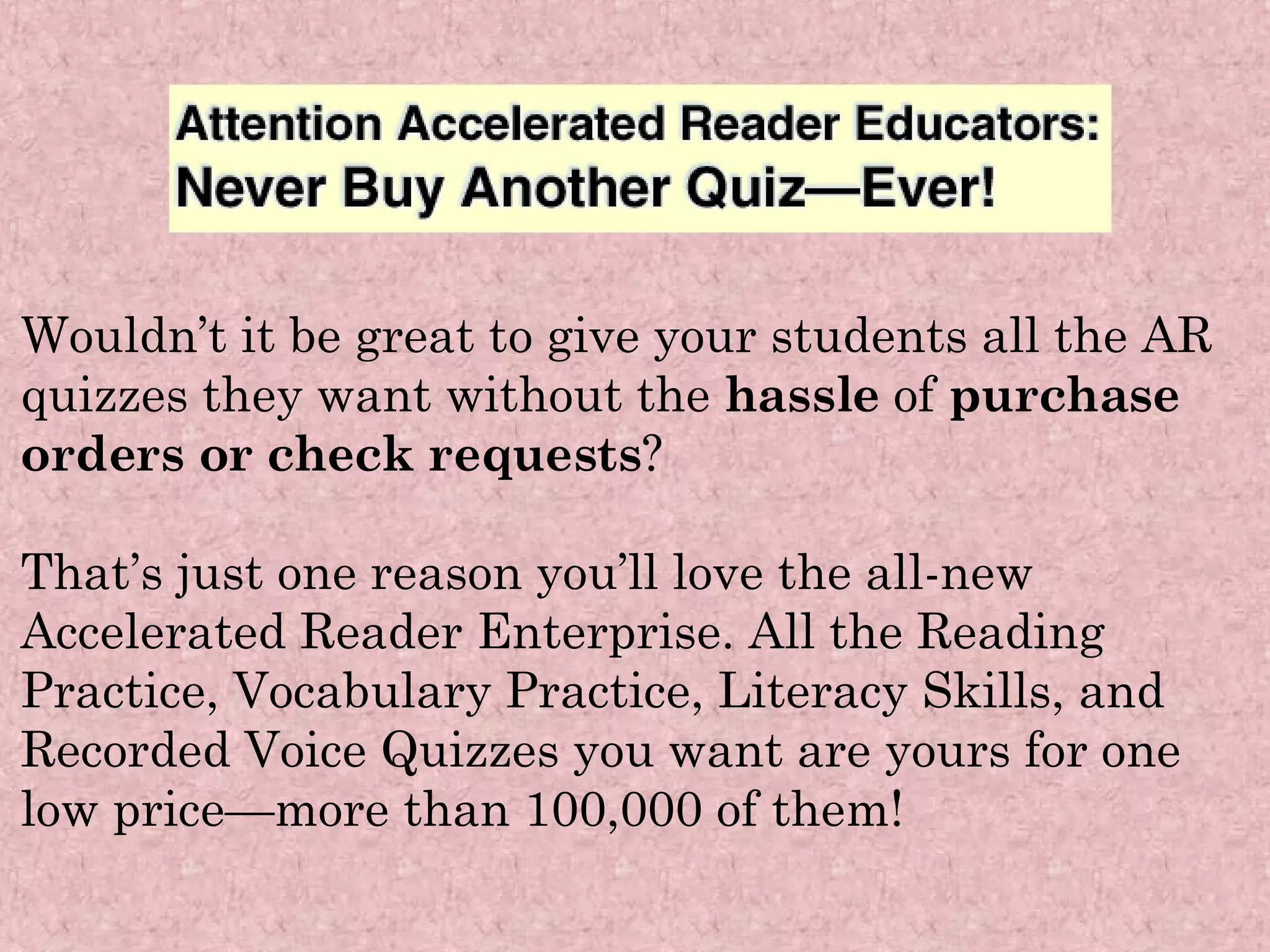 The document summarizes the benefits of Accelerated Reader Enterprise, a web-based program that provides unlimited access to reading practice quizzes, vocabulary practice, and literacy skills tests. Key benefits include access to over 100,000 quizzes and tests for one low price, hosted software to avoid maintenance costs, online support resources, automatic updates, and reporting dashboards to track student progress. It provides cost comparisons showing schools can save thousands per year by switching to the Enterprise program versus individual software licenses.