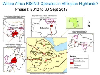 Africa RISING operates in two phases in the Ethiopian Highlands. Phase I from 2012 to 2017 focused on technology identification, testing, and validation through action research. Phase II from 2016 to 2021 aims to scale these innovations through partnerships with development organizations. Africa RISING works on projects like irrigated forages, post-harvest management, fodder trees, and nutrient amendments. In 2017, it reached over 60,000 households across four regions, covering 20,397 hectares of land. While scaling of validated technologies presents opportunities, funding uncertainties pose challenges to partnerships and further work.