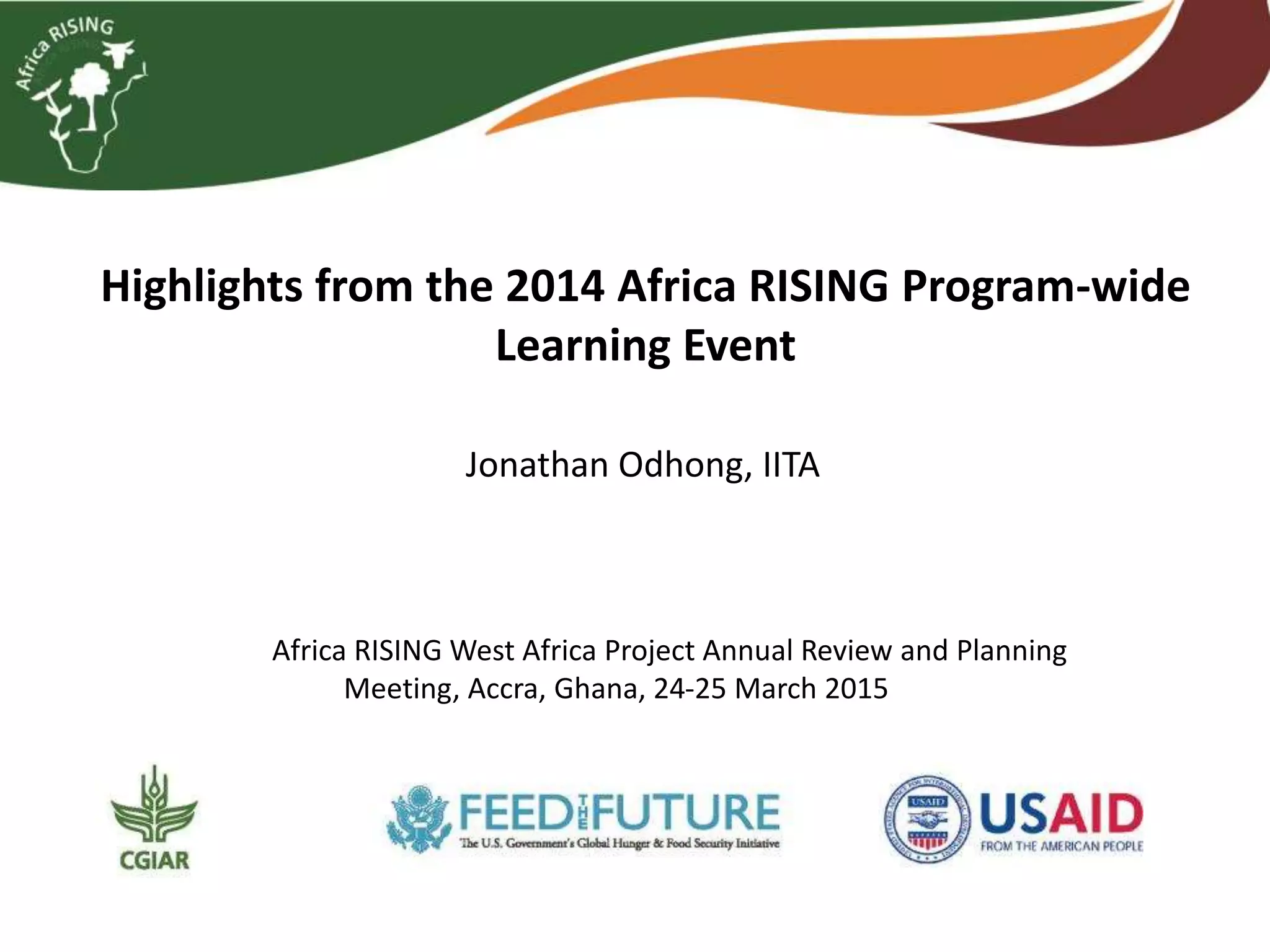 The 2014 Africa Rising program learning event focused on updating the program framework, refining typologies, and discussing innovation systems theory across projects. Key resolutions included revising the program framework, enhancing the documentation of innovation platforms, and establishing a common framework for platform operations. Plans for future events include field visits and a scientific symposium on sustainable intensification in Africa.