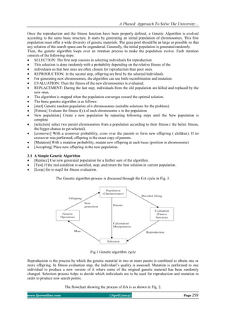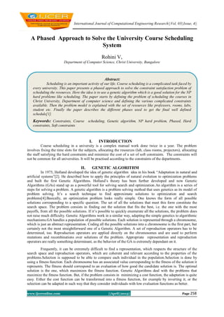 The document discusses using a genetic algorithm to solve the complex problem of university course scheduling. It describes the problem which involves assigning courses, professors, classrooms and time slots while satisfying various hard and soft constraints. A phased approach is proposed which first assigns professors to subjects, then labs to courses, followed by assigning lectures to time slots and labs/tutorials to days and time slots. The genetic algorithm representation and fitness function are defined based on the scheduling problem. The approach is demonstrated on the course scheduling problem at Christ University and is able to generate a timetable that satisfies the hard constraints, though some soft constraints remain unsatisfied.