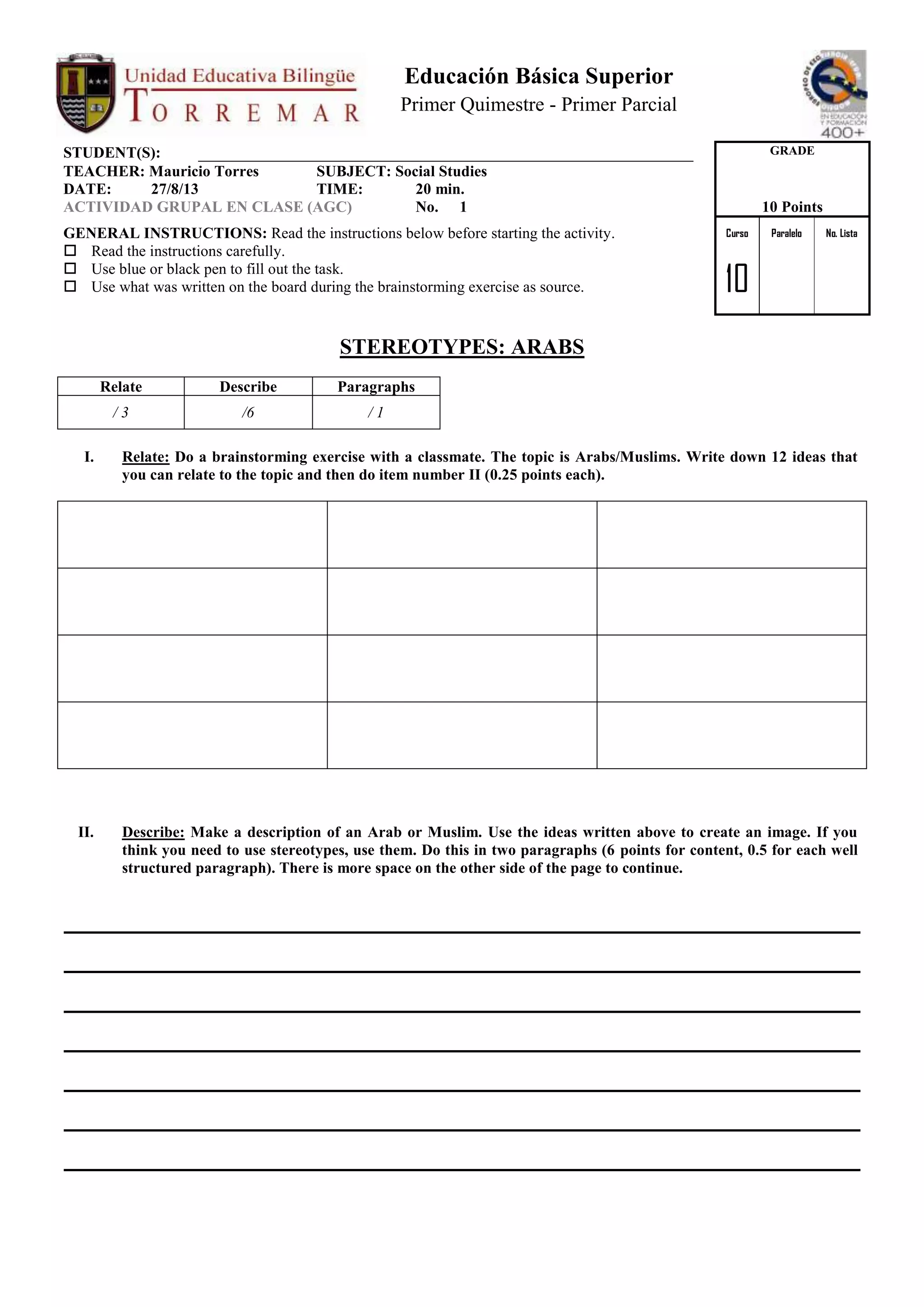 This document is a school activity in social studies class asking students to complete two tasks: 1) Brainstorm and list 12 ideas related to Arabs/Muslims with a classmate. 2) Describe an Arab or Muslim in two paragraphs using the ideas generated, and allowing the use of stereotypes. The activity is worth 10 points total and provides instructions, point values for each part, and space for the students to write their responses.