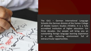 The GILS is the German division of the Yemen College of Middle Eastern Studies, which is a fully accredited higher education institution. For three decades, GILS has provided an outstanding foreign language learning experience in a safe environment with extracurricular opportunities. GILS offers courses in School of Arabic Language, Yemeni Arabic, Arabic Courses, Business Arabic courses, and Intermediate Arabic to help students learn Arabic and communicate effectively in the language.