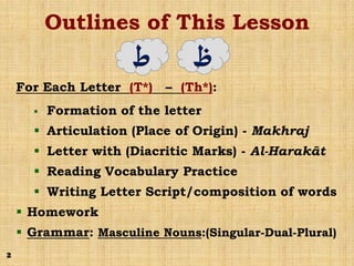 This document provides an outline and lesson for an Arabic language course. It introduces the letters Tā' and Thā' including how to form the letters, where they originate from the mouth, and how to write them in initial, medial, and final positions within words. Vocabulary words are provided to practice reading and writing the letters. Grammar on masculine nouns is also covered. The document emphasizes correct pronunciation of the letters, which have no direct English equivalents.