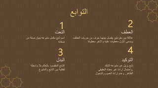 يستعرض الوثيقة أنواع التوابع في اللغة العربية، مثل النعت والبدل والعطف، وأحكامها النحوية. يتم توضيح كيفية استخدام التوابع لتعريف المفردات والعبارات ضمن الجمل. يحتوي النص أيضًا على أمثلة توضيحية لفهم القواعد المتعلقة بالتوابع.