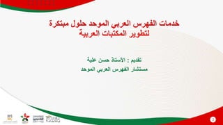 يستعرض المستند إنجازات الفهرس العربي الموحد للمكتبات، حيث تم تسجيل 2.7 مليون ببليوغرافيا و690,000 عضو. كما تم إجراء 45 دورة تدريبية و31,000 زيارات افتراضية، مما يعكس النشاط الكبير والتفاعل مع الأعضاء. يوفر الفهرس خدمات مبتكرة تلبية للاحتياجات الحقيقية للمكتبات ويعتمد على أحدث المعايير الدولية.