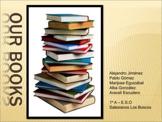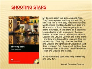 The document contains summaries from five student books. Araceli Escudero's book is about two girls, Lisa and Alice, who go on holiday to Greece and believe they see their favorite actors filming until realizing it was just part of a movie. Pablo Gómez's book is about a captain who discovers a photo of himself and a secret book on an abandoned ship. Marijose Eguizabal's book follows a girl named Alissa who is taken in by a man and lives in a small, dark room before moving in with an older girl. Alejandro Jiménez's book features a private investigator named Lenny who has to help ransom a rich man's kidnapped daughter. Alba González's book