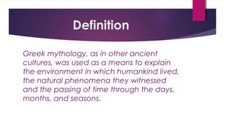 Greek mythology was used by ancient Greeks to explain natural phenomena and the environment. Myths were closely connected to Greek religion and explained the origins of the gods and humanity, the afterlife, and how to live a good life. One example is the myth of Arachne, who was transformed into a spider by the goddess Athena after Arachne arrogantly challenged her to a weaving contest, in order to explain the creation of spiders.