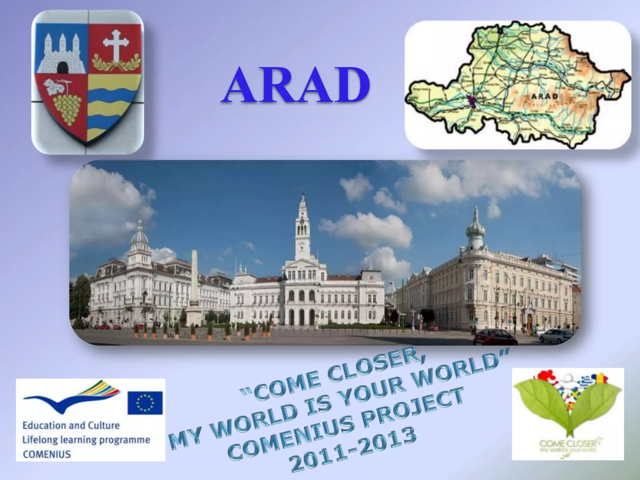 The city of Arad is located in western Romania on the banks of the Mures River. It was first mentioned in the 11th century and was ruled by the Kingdom of Hungary, Ottoman Empire, and Habsburg Empire. In the 19th-20th centuries, Arad became an important economic and cultural center. In 1918, Arad played a key role in the movement for Romanian unification. Today, Arad is the capital of Arad County and the third largest city in western Romania.