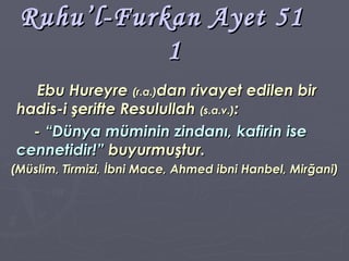 Ruhu’l-Furkan Ayet 51 1 Ebu Hureyre (r.a.) dan rivayet edilen bir hadis-i şerifte Resulullah (s.a.v.) : - “Dünya müminin zindanı, kafirin ise cennetidir!” buyurmuştur. (Müslim, Tirmizi, İbni Mace, Ahmed ibni Hanbel, Mirğani)