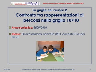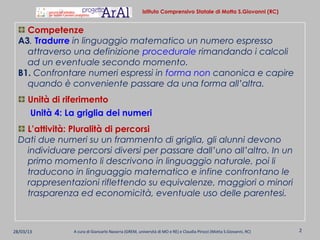 Il documento descrive un'attività didattica per gli alunni della classe quinta primaria dell'istituto comprensivo di Motta S. Giovanni (RC), focalizzata sull'esplorazione di diverse rappresentazioni matematiche su una griglia 10x10. Gli studenti sono invitati a trovare e descrivere percorsi tra numeri, traducendoli poi in linguaggio matematico e confrontando le diverse rappresentazioni, promuovendo riflessioni su trasparenza ed economicità dei calcoli. L'attività mira a sviluppare competenze matematiche e linguistiche attraverso la verbalizzazione e il confronto collettivo delle soluzioni proposte.