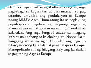 Ang pag-usbong ng Renaissance ay nag-ugat sa pag-unlad ng agrikultura at kalakalan sa mga lungsod-estado ng Hilagang Italy noong Middle Ages, na humantong sa paglaki ng populasyon at pangangailangan. Ang Renaissance, na nangangahulugang 'muling pagsilang,' ay isang kilusang intelektuwal na nagtatangkang ibalik ang kultura ng sinaunang Greece at Rome at itinuturing na isang transisyon mula sa Middle Ages patungo sa Modernong Panahon. Ang humanismo, na mahalaga sa Renaissance, ay tumutukoy sa pagpapahalaga sa mga ideya at karunungan mula sa klasikal na sibilisasyon upang makamit ang isang moral at makabuluhang buhay.