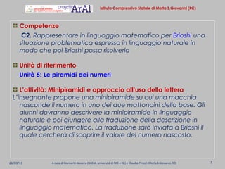 Il documento descrive un'attività didattica svolta nelle classi quarte della scuola primaria di Motta S. Giovanni, incentrata sull'uso della lettera come incognita in situazioni matematiche. Gli alunni imparano a tradurre descrizioni in linguaggio naturale in espressioni matematiche, affrontando la rappresentazione di numeri nascosti attraverso simboli e lettere. Il processo educativo promuove la negoziazione collettiva delle rappresentazioni algebriche, evidenziando l'importanza di sviluppare competenze algebriche attraverso attività pratiche e collaborative.