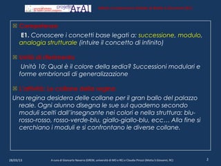 Il documento descrive un'attività didattica per aiutare gli alunni della classe prima primaria a consolidare il concetto di modulo attraverso la creazione di collane con colori e moduli. Gli studenti disegnano le collane, praticano la regolarità e si impegnano in discussioni sui loro lavori, promuovendo il pensiero relazionale e la ricerca di regolarità. Inoltre, viene sottolineata l'importanza di evidenziare i moduli per correggere eventuali errori e migliorare la comprensione.