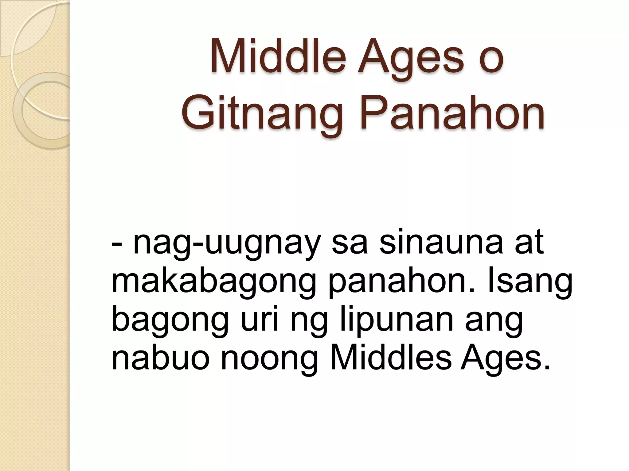 Ang Middle Ages, o gitnang panahon, ay nag-uugnay sa sinaunang at makabagong panahon, na nagbunga ng isang bagong lipunan mula sa pamanang klasikal ng Rome, paniniwala ng Simbahang Katoliko, at kaugalian ng mga tribong Germanic. Sa kabila ng mga pagsisikap nina Diocletian at Constantine na mapanatili ang kapangyarihan ng imperyo, ang paghina ng pampulitikang katatagan at paglusob ng mga Germanic ay nagdulot ng pagbagsak ng Kanlurang Imperyong Roman. Kasabay nito, umusbong ang Kristiyanismo bilang pinakamakapangyarihang institusyon sa lipunan habang humihina ang mga tradisyunal na sistema ng kalakalan at komunikasyon sa Europa.