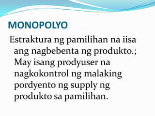 Ang aralin ay tumatalakay sa mga istruktura ng pamilihan tulad ng monopolyo at monopsonyo, kung saan iisa ang nagbebenta o konsyumer ng produkto. Tinatalakay din ang monopolistiko ng kompetisyon na nagbibigay-daan sa mga prodyuser na itakda ang presyo batay sa kanilang gastusin. Sa oligopolyo, kakaunti ang prodyuser at madalas ay may kolusyon sa pagtatakda ng presyo at pag-aadvertise.
