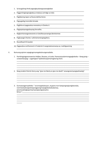This document contains questions about various people, events, and concepts in history. The questions are about Hindu practices in India, military groups, important battles and treaties, monarchs and their statements, territories that were taken or disputed, religious conflicts, and more. It also includes matching and fill-in-the-blank questions, as well as short answer questions asking about the effects of certain events and comparing philosophical perspectives on human nature.