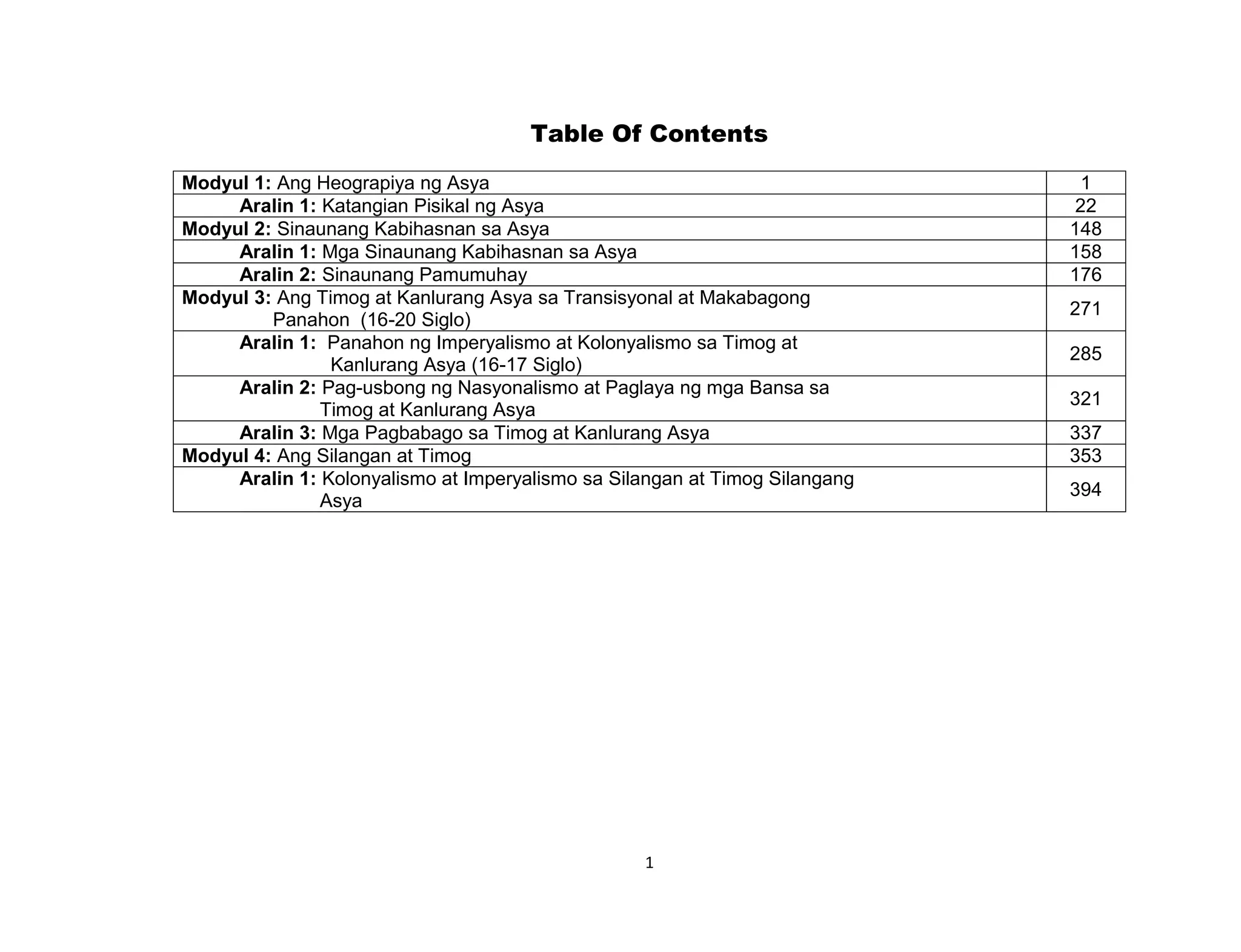Ang dokumento ay isang modyul sa Araling Panlipunan para sa ikapitong baitang na tumatalakay sa heograpiya, sinaunang kabihasnan, at mga pagbabago sa Asya mula sa imperyalismo hanggang sa makabagong panahon. Tinatalakay nito ang mga katangian pisikal ng Asya, yamang likas, at ang ugnayan ng tao at kapaligiran. Layunin ng modyul na maipakita ang pagbuo at pag-unlad ng kabihasnang Asyano sa iba't ibang aspeto tulad ng kultura at ekonomiya.