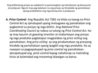 Ang dokumento ay naglalarawan ng gampanin ng pamahalaan sa pamilihan sa pamamagitan ng price control at price support upang protektahan ang mga konsyumer at prodyuser. Tinalakay din ang relasyon ng input at output sa production function, kasama na ang iba't ibang uri ng gastusin sa produksyon at mga estruktura ng pamilihan, gaya ng ganap na kompetisyon. Ipinakita ang mga prinsipyo ng pamilihan, ang pagtatakda ng presyo at lebel ng produksyon, at ang mga paraan upang makalkula ang mga gastusin sa produksyon.