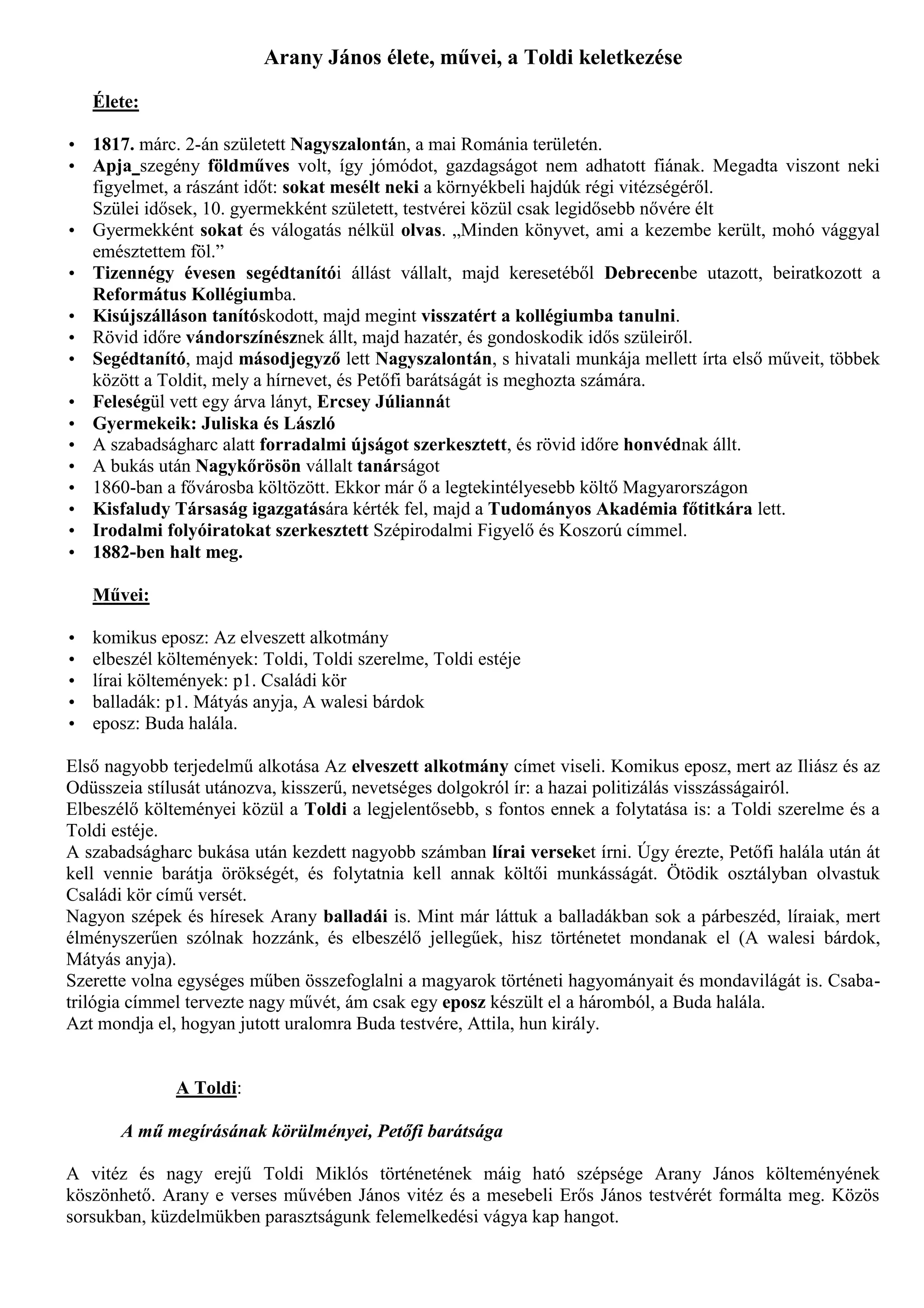 Arany János élete,művei, a Toldi keletkezése