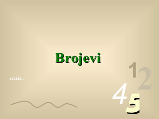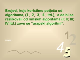Brojevi, koje koristimopotječu od algoritama, (1, 2, 3, 4, itd. ), a da bi se razlikovali od rimskih algoritama ( I; II; III; IV itd.) zovu se “arapski algoritmi”. 013456… 1 2 4 5