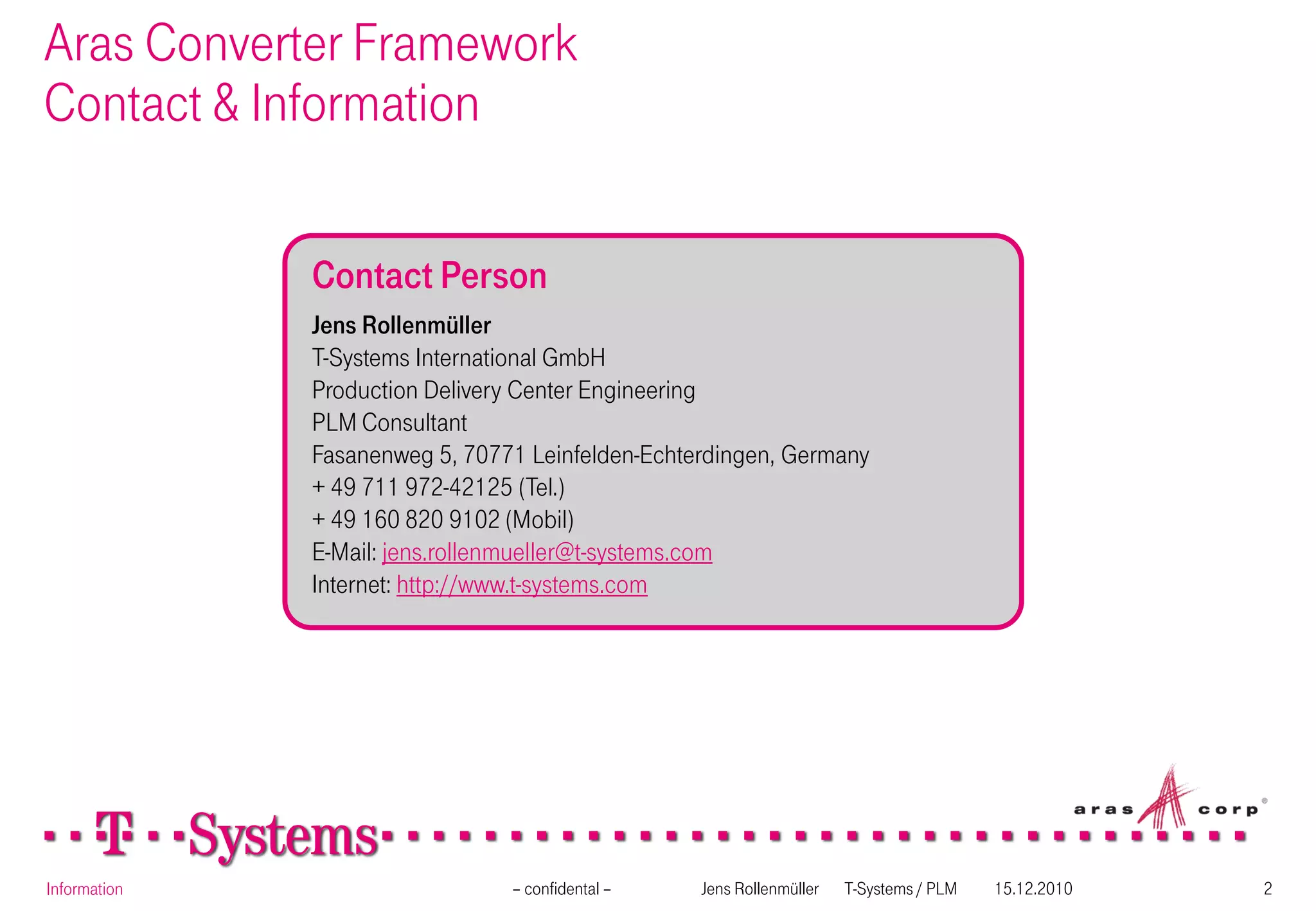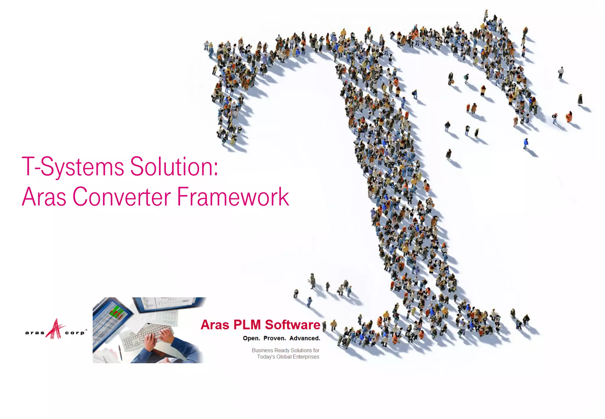 The T-Systems Solution provides a fully integrated framework for file conversions within Aras Innovator. It allows users to easily setup, administer, manage and monitor conversions. The framework automatically converts files like documents to PDF upon check-in to Aras and attaches the converted files to the relevant items. Administrators can easily create new conversion jobs and monitor conversion logs within Aras Innovator. The solution improves access to files for all users and eliminates the need for companies to create their own conversion capabilities.