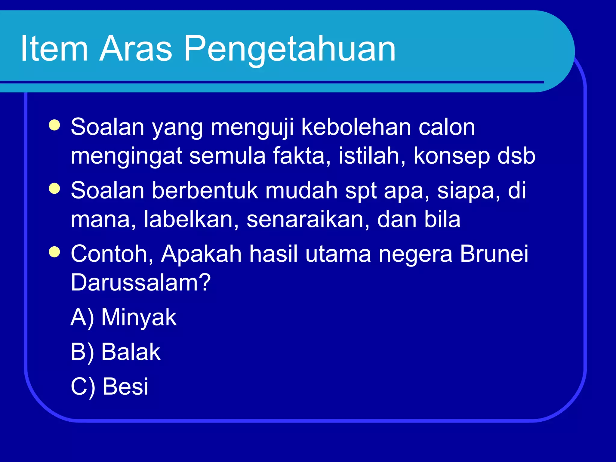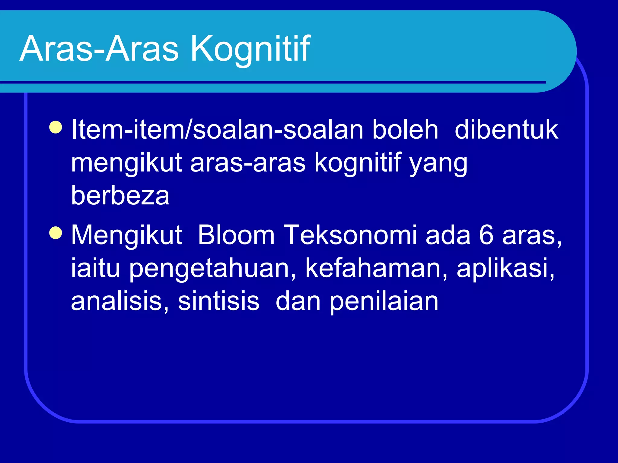 Dokumen ini menerangkan pelbagai aras kognitif yang boleh digunakan untuk membentuk item atau soalan mengikut taksonomi Bloom, termasuk aras pengetahuan, kefahaman, aplikasi, analisis, sintesis, dan penilaian. Setiap aras mempunyai panduan bentuk soalan yang sesuai dan contoh yang menggambarkan cara pengujian kebolehan calon dalam pelbagai konteks. Ini membantu dalam merangka penilaian yang lebih berkesan dan menyeluruh dalam pendidikan.