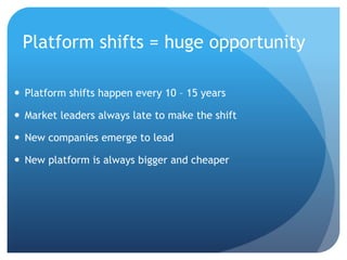 This document discusses how platform shifts happen every 10-15 years and lead to new market leaders. It notes that the smartphone platform shift is already resulting in 10x more devices than PCs and that smartphone sales now exceed PCs. The mobile platform is still in the early stages of growth and represents huge opportunities in areas like mobile apps, games, payments and ecommerce. The document advocates investing in the long term potential of the mobile platform despite challenges in estimating its true size and impact.