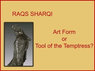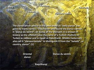 Belly dancing has origins in ancient fertility rituals and traditions from various Middle Eastern cultures. It developed into a professional art form in Egypt in the early 20th century, led by influential dancers like Samia Gamal and Tahia Carioca. While belly dancing is still popular in some contexts, it also faces criticism and stigma in conservative Islamic societies as promoting immodesty. Today it struggles for acceptance in the modern Arab world but remains an important part of cultural heritage and expression.