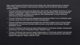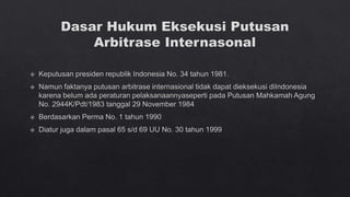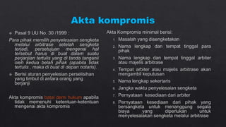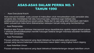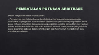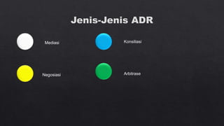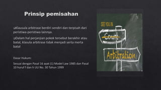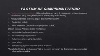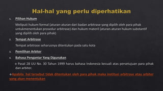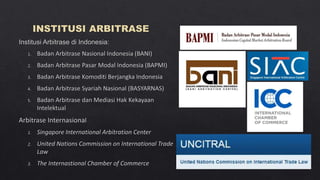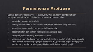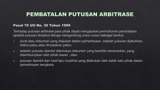 Dokumen tersebut membahas tentang arbitrase sebagai salah satu metode alternatif penyelesaian sengketa di luar pengadilan. Arbitrase didasarkan pada perjanjian tertulis para pihak untuk menyelesaikan sengketanya di hadapan arbiter yang dipilih sendiri. Putusan arbitrase bersifat final dan mengikat para pihak. Proses arbitrase lebih cepat dibanding pengadilan dan sidangnya bersifat tertutup.