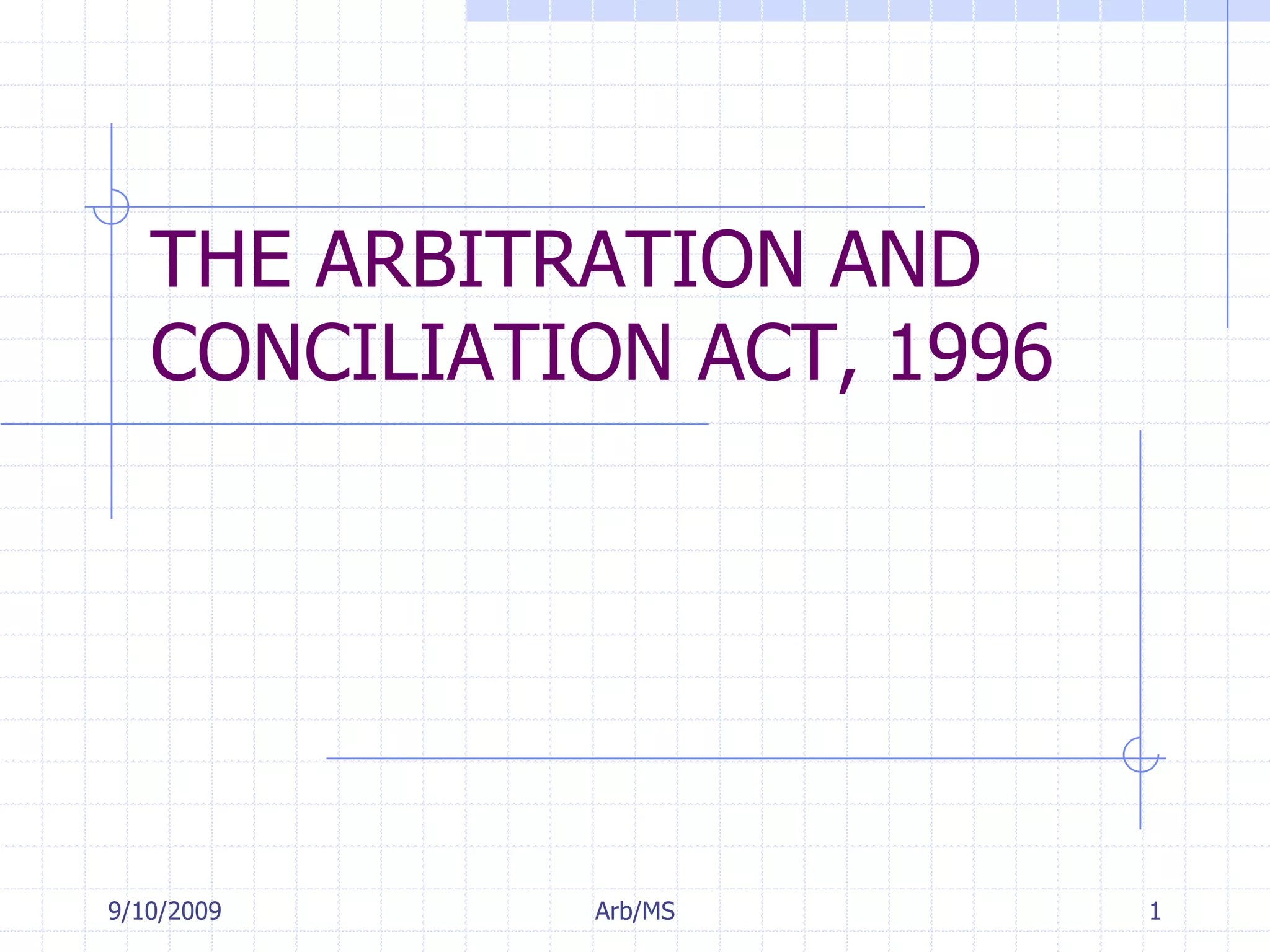 The document discusses key aspects of arbitration law in India, including the Arbitration and Conciliation Act of 1996 and subsequent amendments. It outlines objectives of the amendments such as minimizing court supervision of arbitrations and allowing arbitral tribunals to use mediation and conciliation. Benefits of arbitration for parties include flexibility in procedure and choice of location and laws. The document also describes when courts can intervene in arbitrations and sets out requirements for arbitration agreements and awards.