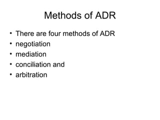 The document discusses key aspects of arbitration and conciliation in India according to the Arbitration and Conciliation Act 1996. It provides an overview of alternative dispute resolution methods like negotiation, mediation, conciliation and arbitration. It explains that certain matters like divorce, taxation and criminal cases cannot be referred to arbitration. The essence of arbitration is that an arbitrator provides a quasi-judicial decision to settle disputes between parties in a speedy and inexpensive manner. The document outlines procedures for appointing arbitrators and conducting arbitral proceedings.
