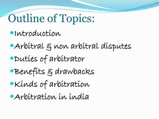 This document discusses arbitration and provides details on various aspects of the arbitration process. It begins with an introduction defining arbitration as an impartial third party making a binding decision to resolve a dispute between two parties. It then covers arbitral and non-arbitral disputes, the duties of an arbitrator, benefits and drawbacks of arbitration, and different types of arbitration including voluntary, compulsory, ad-hoc, institutional, statutory, domestic, international and foreign arbitration. The document also provides an overview of arbitration in India, noting key organizations like the Indian Council of Arbitration and provisions in the Arbitration and Conciliation Act of 1996.