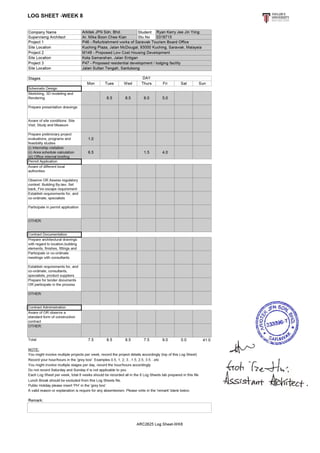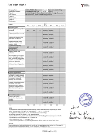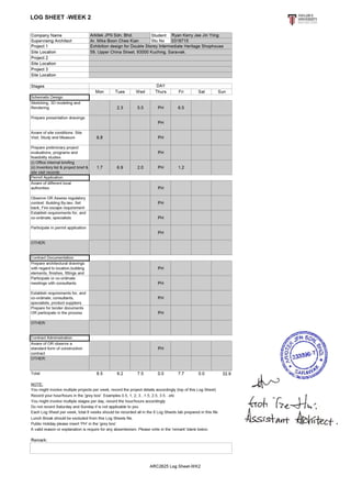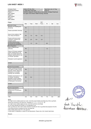 The intern gained knowledge of the planning and building submission process through working on various projects at an architecture firm over 8 weeks. They were involved in 2 main projects - an interior exhibition design for a heritage shophouse, and renovations for a terrace house. They also assisted with other projects such as housing developments, office renovations, and submission drawings. The intern learned about project documentation, 3D modeling, site analysis, and the workflow within an architecture office.