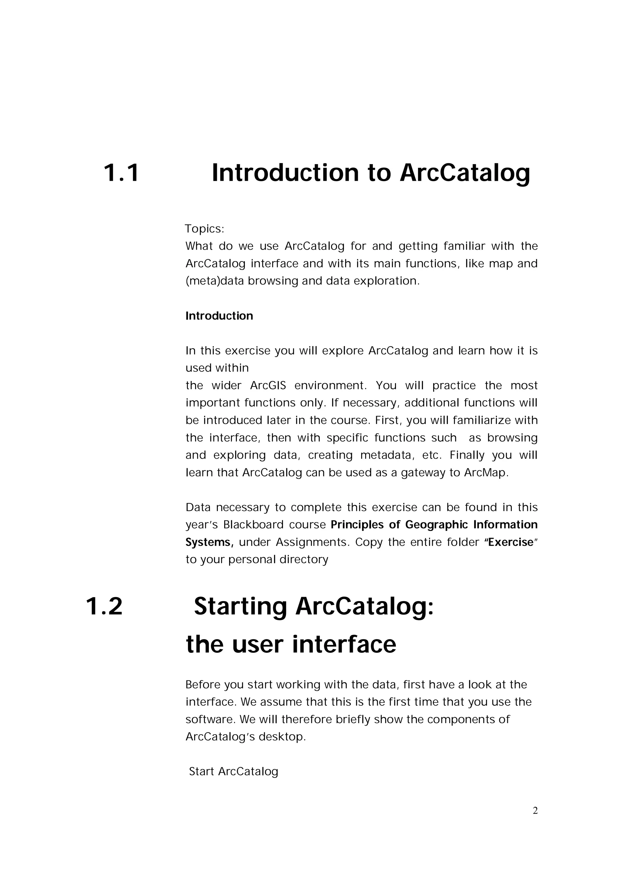 This document is an introductory guide to ArcCatalog 2, part of the ArcGIS environment, focusing on its interface, basic functions, and data management capabilities. Users will learn to browse, explore, and manage geographic data within ArcCatalog, as well as create and edit metadata. Additionally, it highlights how ArcCatalog serves as a gateway to ArcMap for further data analysis and map creation.